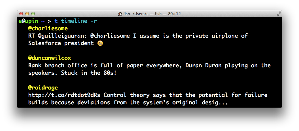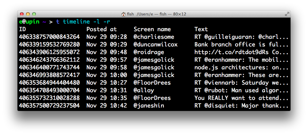 t is an AWESOME command line Twitter client! It can do everything from tweet to check who your friends follow and even export data into a spreadsheet!