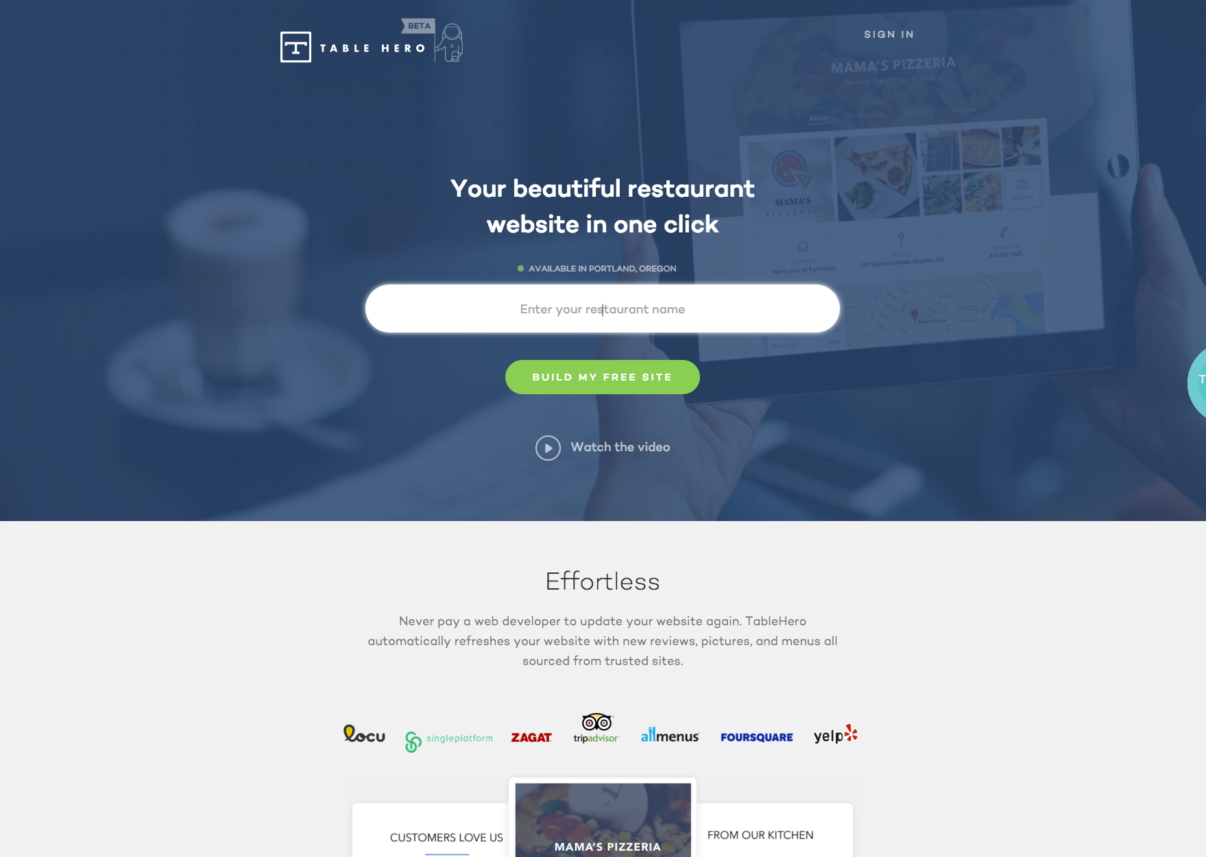 Hey Product Hunt community, I'm one of the founders of TableHero. We're very excited about the stuff we're building for small local business owners. Try building a website in less than 10 seconds, and if you're unfamiliar with restaurants in Portland, OR (our beta is limited to Portland), here's a list: