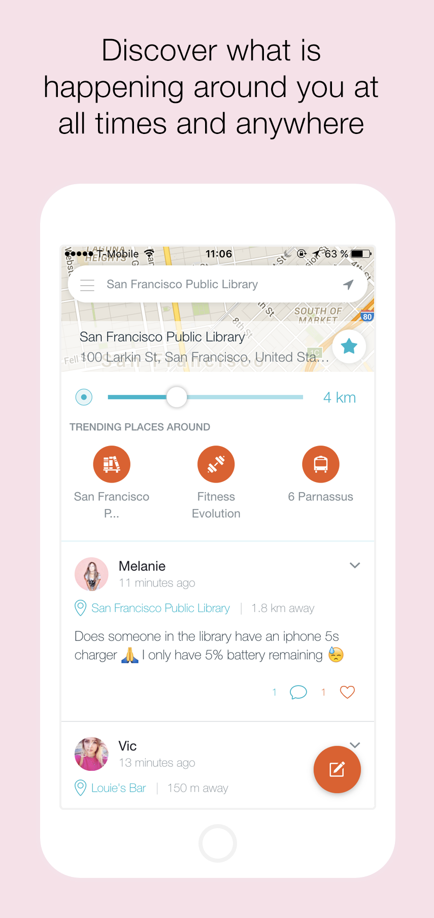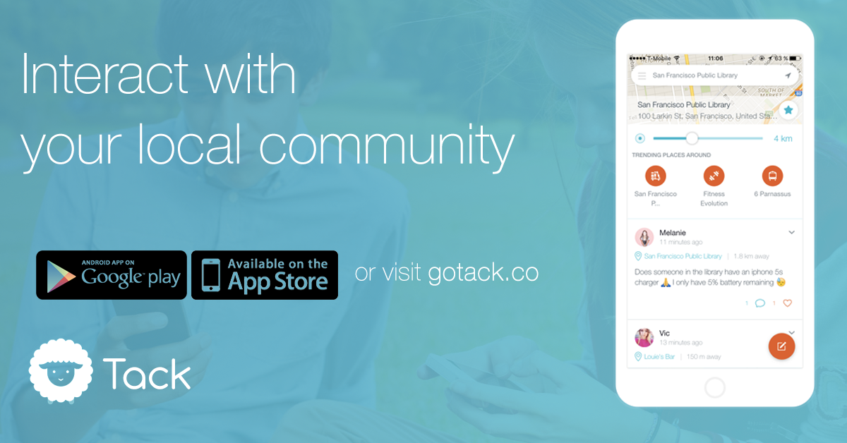 Tack acts like a local bulletin board in your area by showing the most recent posts from other users nearby. Not only your neighbourhood, but also in your company, in your campus or at your favorite spot.