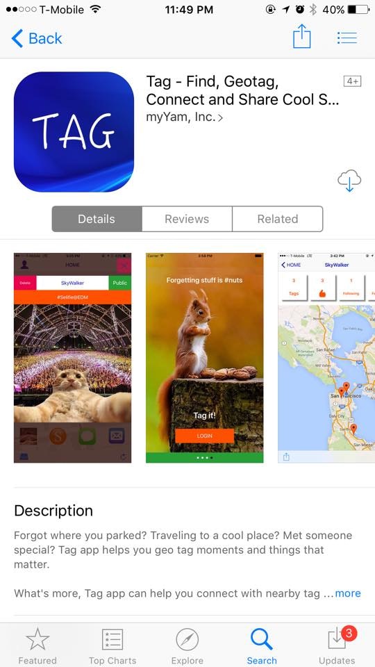 TAG started with sometimes we are looking to find our own parking spots and things. With the geo tag and sharing/social feature in 2.0 release, we discover it is also a quick way to connect with others and find the neat stuff nearby. We are looking to bring more live feature and improve current ones! Thank you for checking TAG out. 😄 - Luke, MyYam