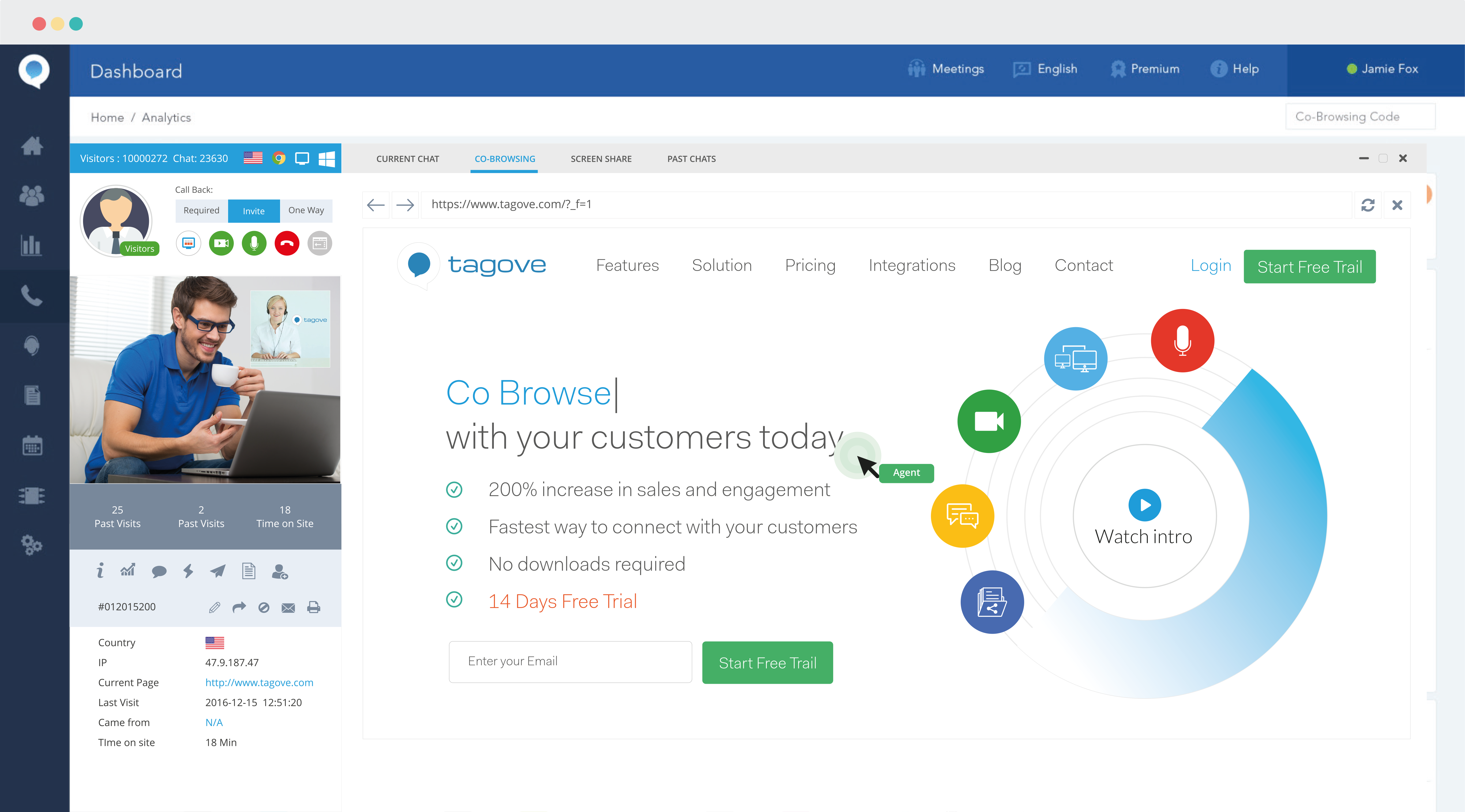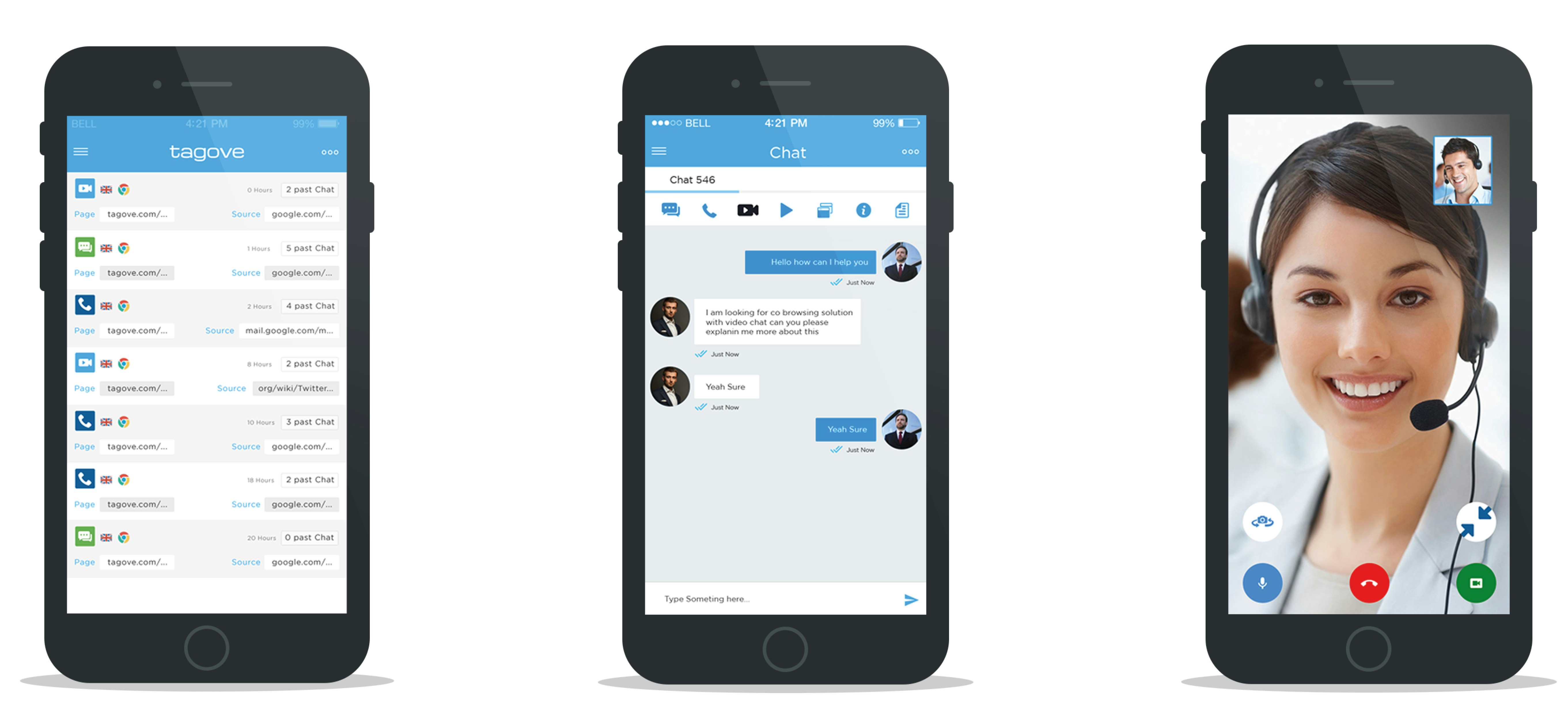 Tagove comes with awesome & flexible video-voice call features, along with co-browsing, screen sharing, VOIP, and CRM at one single place.