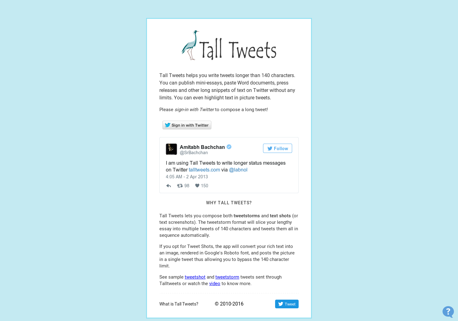 Tall Tweets helps you write tweets longer than 140 characters. You can publish mini-essays, paste Word documents, press releases and other long snippets of text on Twitter without any limits. You can even highlight text in picture tweets.