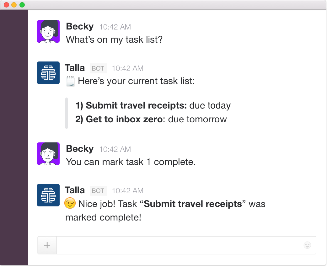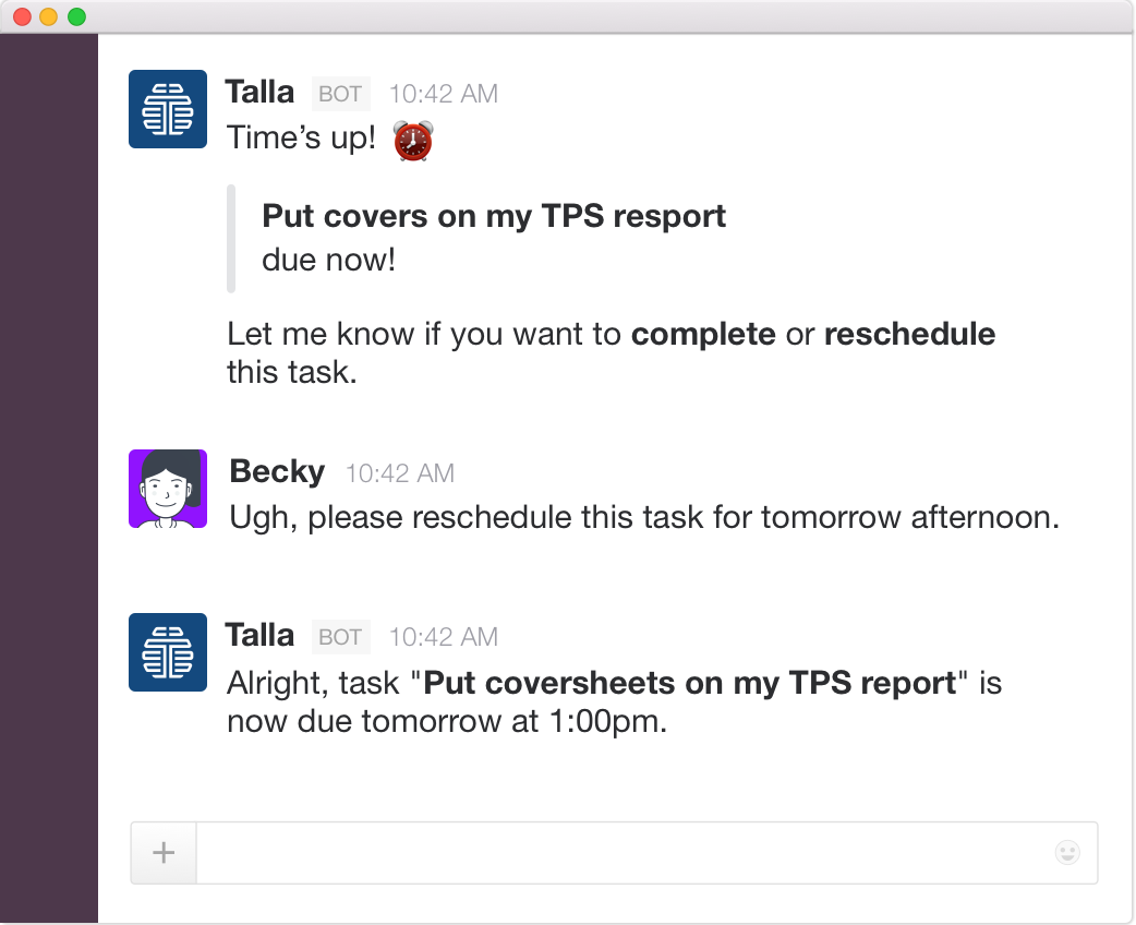 Hi Everyone. The Talla team is around if you have any questions. New features coming out in the next week or so include group task lists, and the ability to set reminders for someone else in your org.
