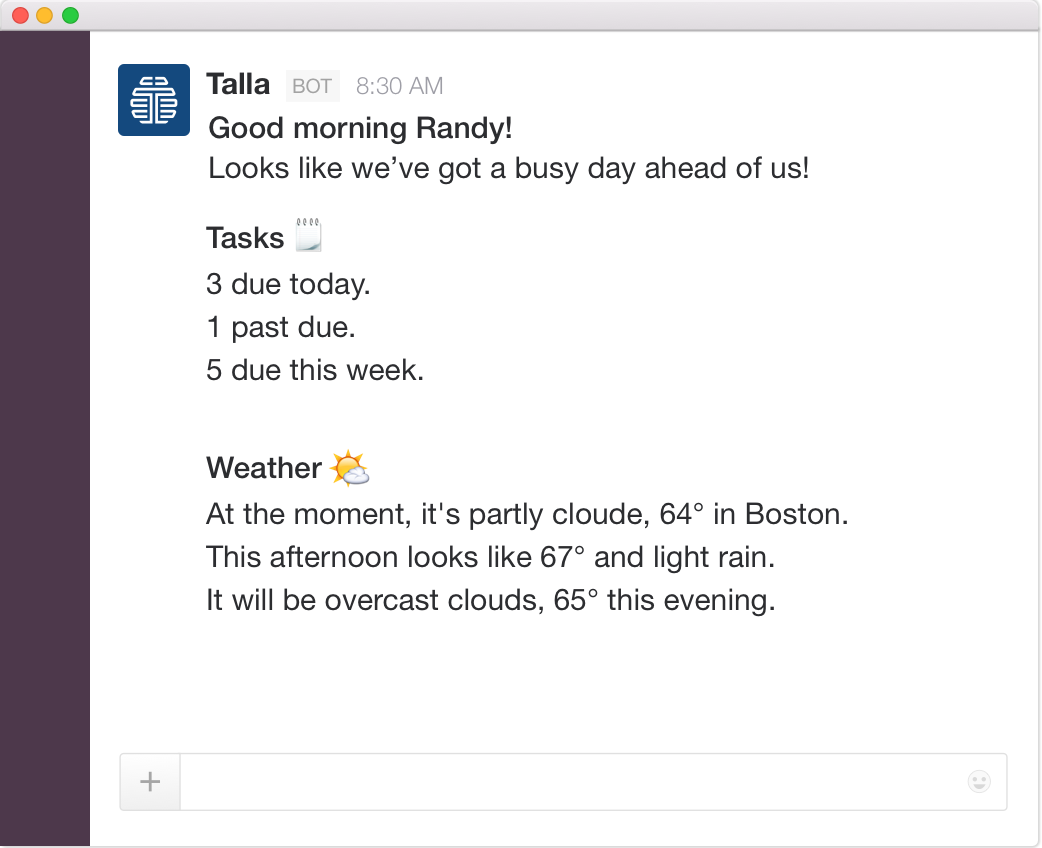 Love the idea here. Combining this with Howdy.ai is a productivity/accountability dream.