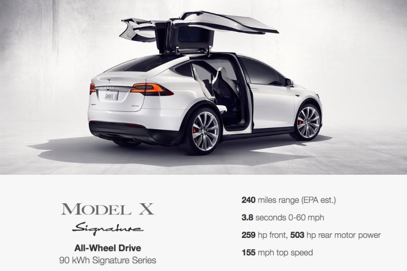 The Tesla Model X is a mid-size all-electric luxury crossover made by Tesla, Inc. The vehicle is notable in that it uses falcon-wing doors for passenger access.