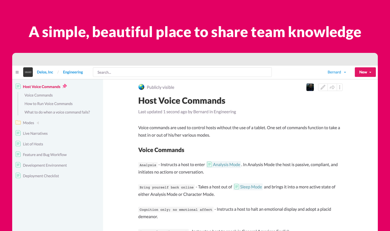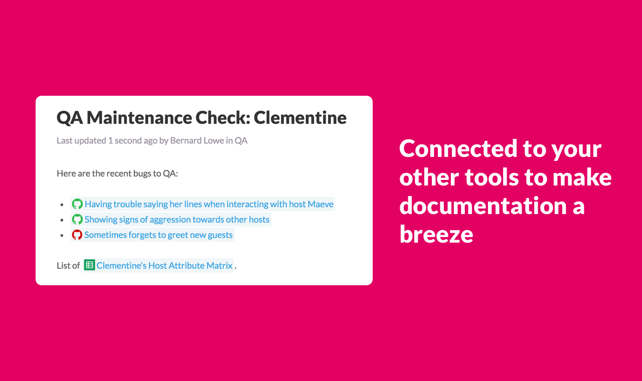 Integrates with Slack (no separate login), clean and simple UI, great editor, fantastic customer support, "suggested pages" feature