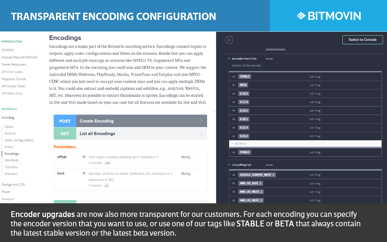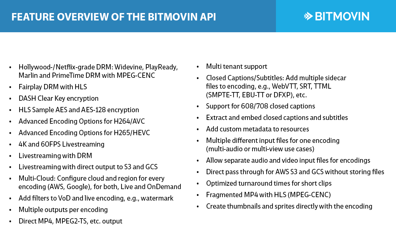 We are very excited to launch the new version of our video infrastructure API. The new Bitmovin API bundles our successful video encoding and video player services with a new video performance analytics product as well as integrations into various storage and content delivery network (CDN) providers. The result is an end-to-end video infrastructur… See more