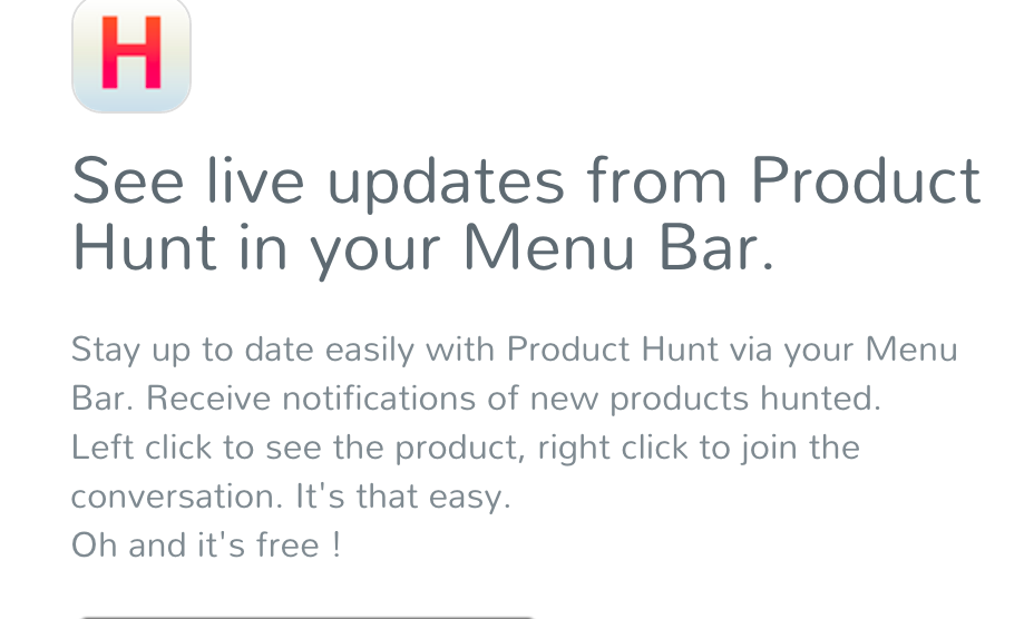 "Stay up to date easily with Product Hunt via your menu bar. Receive notifications of new products hunted. Left click to see the product, right click to join the conversation."
