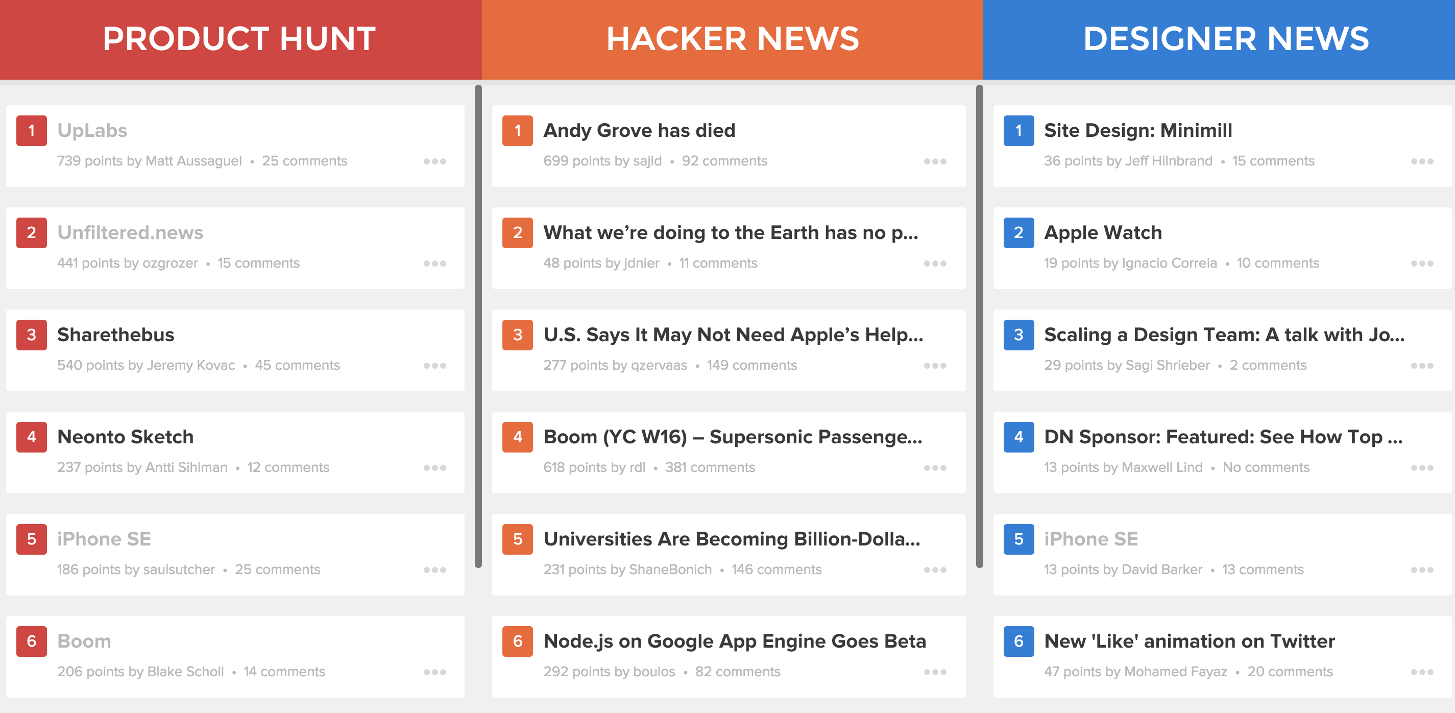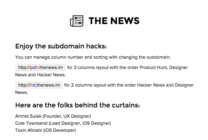 Hello everyone, super excited to launch the new version of TheNews. Now you can enjoy reading Product Hunt, Hacker News and Designer News side by side with the new design that I’ve worked on with @twnsndco. Don’t forget to adjust your columns with our subdomain hack :)