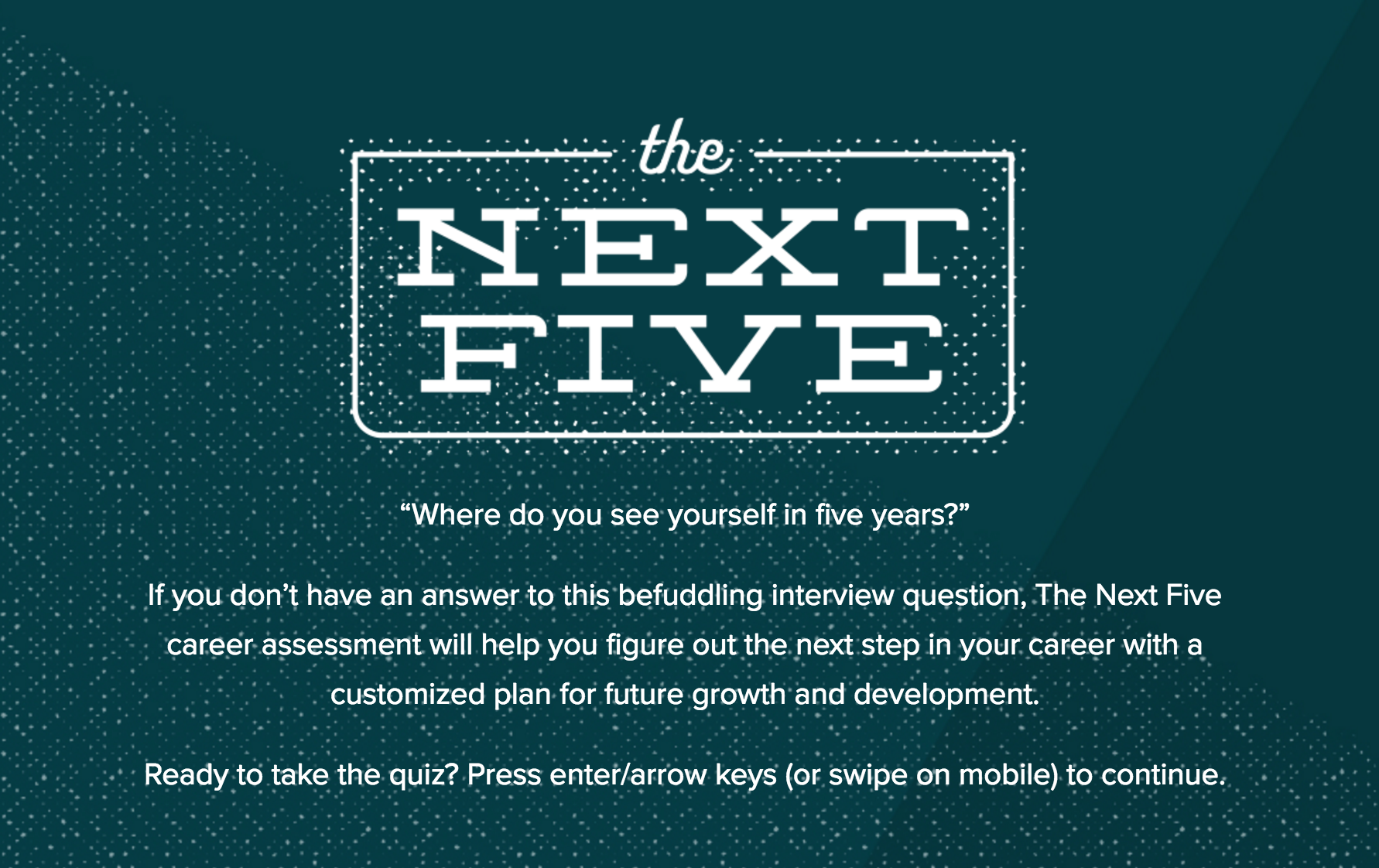 The Next Five is a career assessment that helps you identify your next step. The quiz asks you 19 questions to help gauge your interests, strengths, and working style… See more