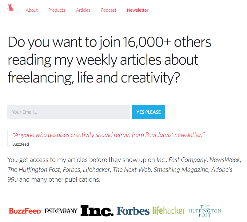 I’ve been running my newsletter for almost two years, every Sunday AM (PST), no exceptions. I talk about freelancing, creativity, entrepreneurship and really anything that falls under “life” for those us who live/work online.