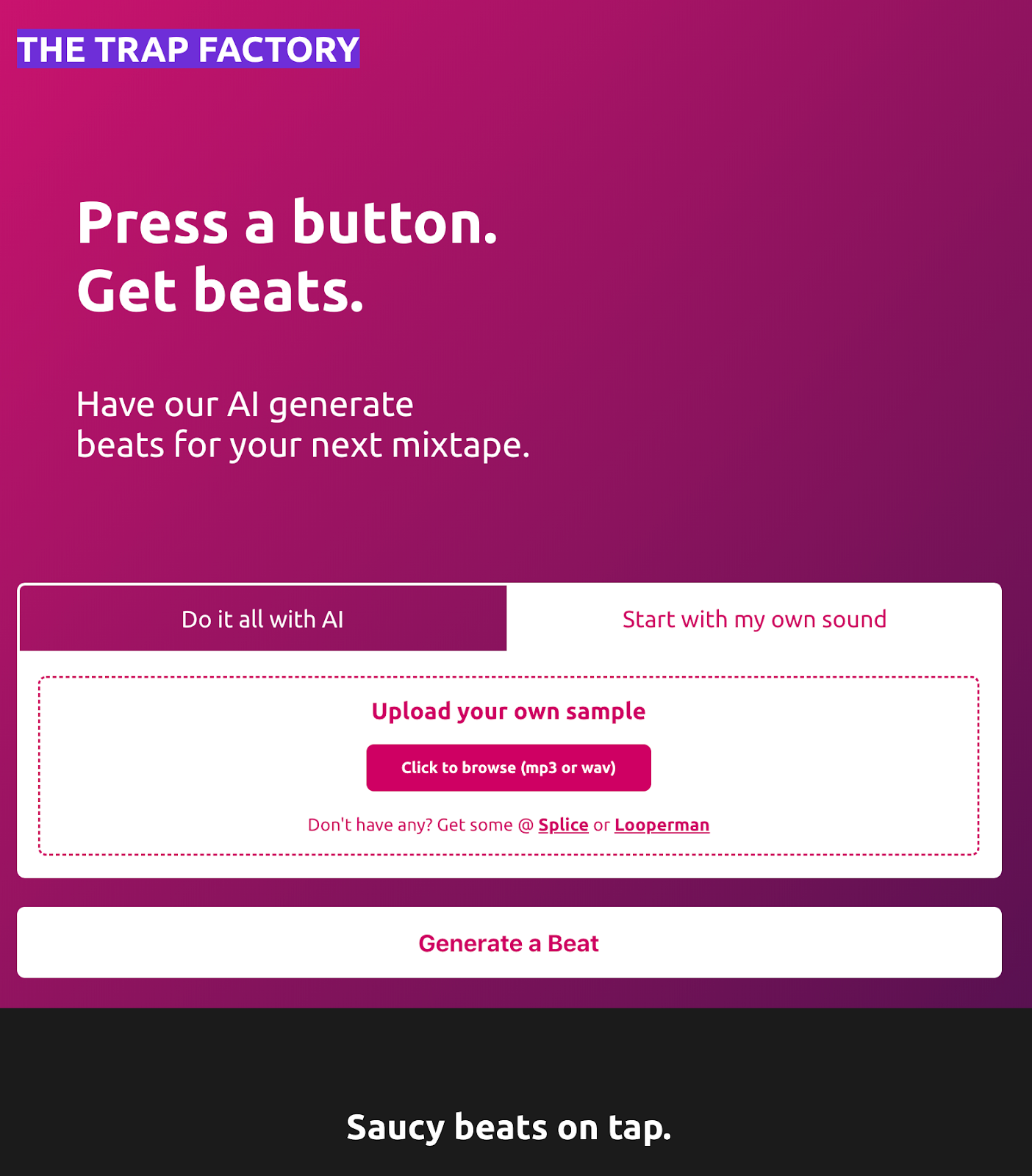 Have a certain sound in mind? Want to have a bit more control? We have a second "mode" where you can upload your own sample, and our AI will create a beat *using* that sample.