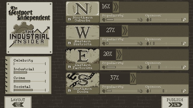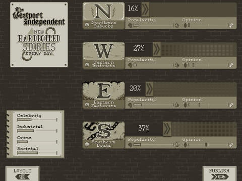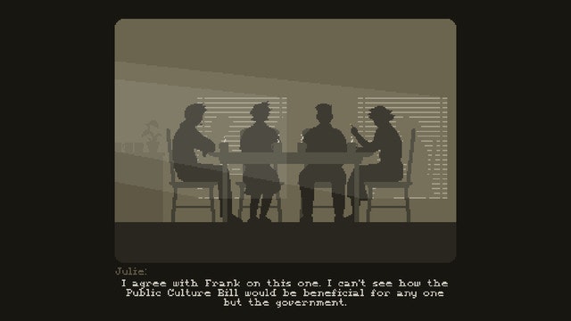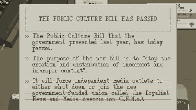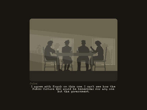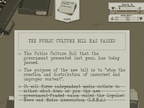 Well the tagline pretty much sums it all :) This game is about censorship, corruption and the pressure on the press. The artistic style is great, at least to my taste :) The game brings the rebel in you into the light. Well done.