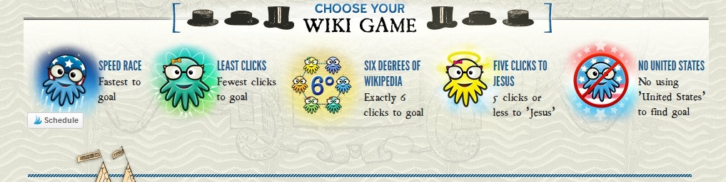 Fun game of linking through wikipedia articles from an assigned starting article to a goal article. Built by Alex Clemensha in San Diego. http://thewikigame.com/
