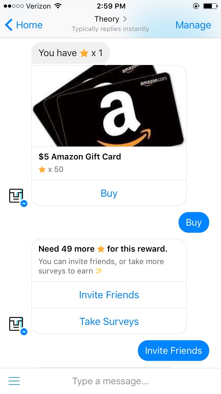 Quite simple. You complete daily surveys on FB Messenger, and get points to earn Amazon Giftcards (Other rewards coming soon).