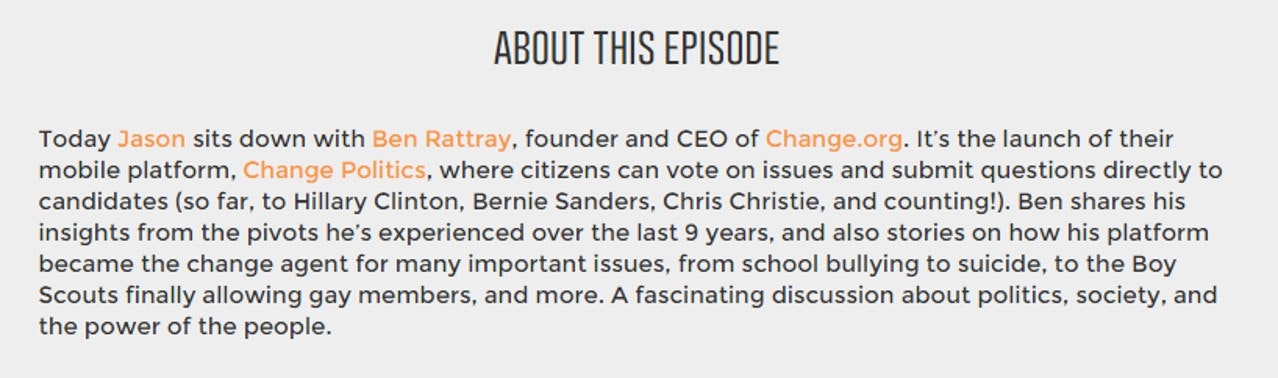 I listened to this one over the weekend. I didn't realize Change.org is a 9+ year old company. It's inspiring to see a founder/CEO (in this case, @brattray) continuing to pursue a mission that started a decade ago.