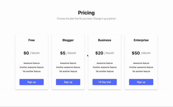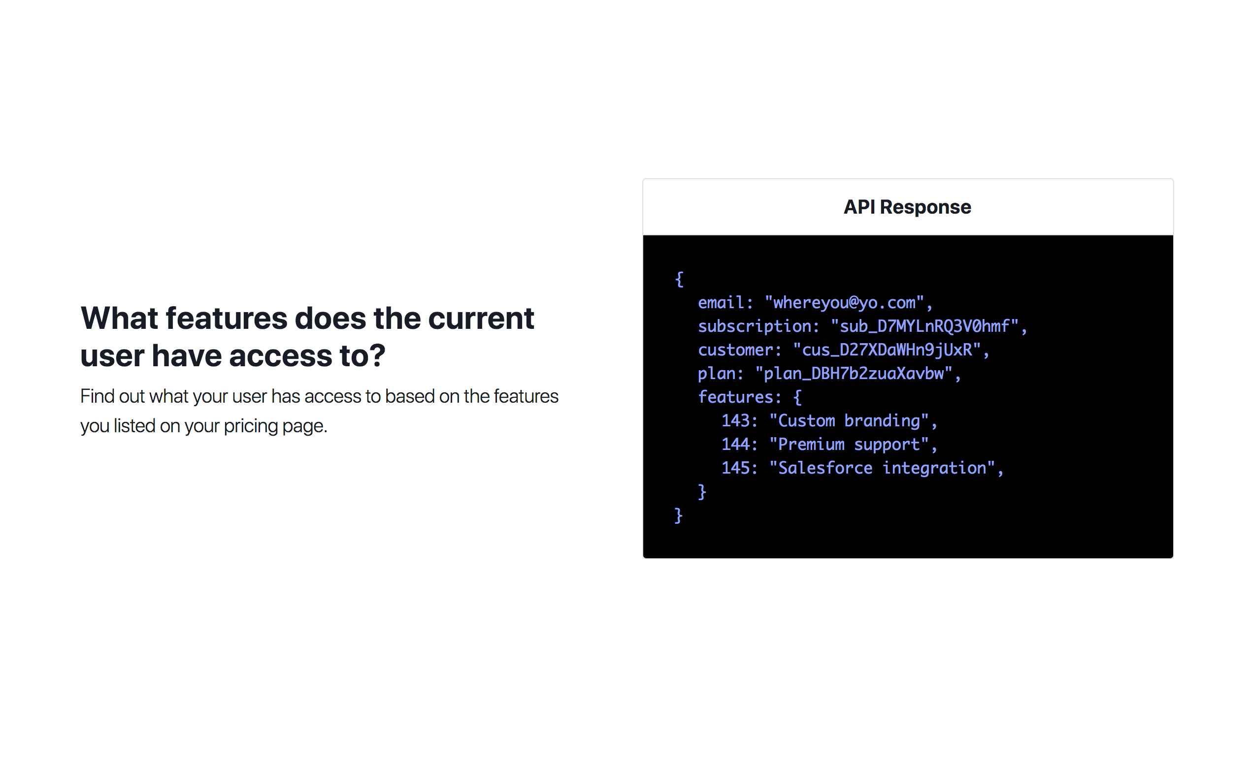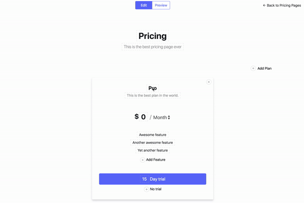 - A simple pricing page builder for managing your subscription plans AND the features available to those plans