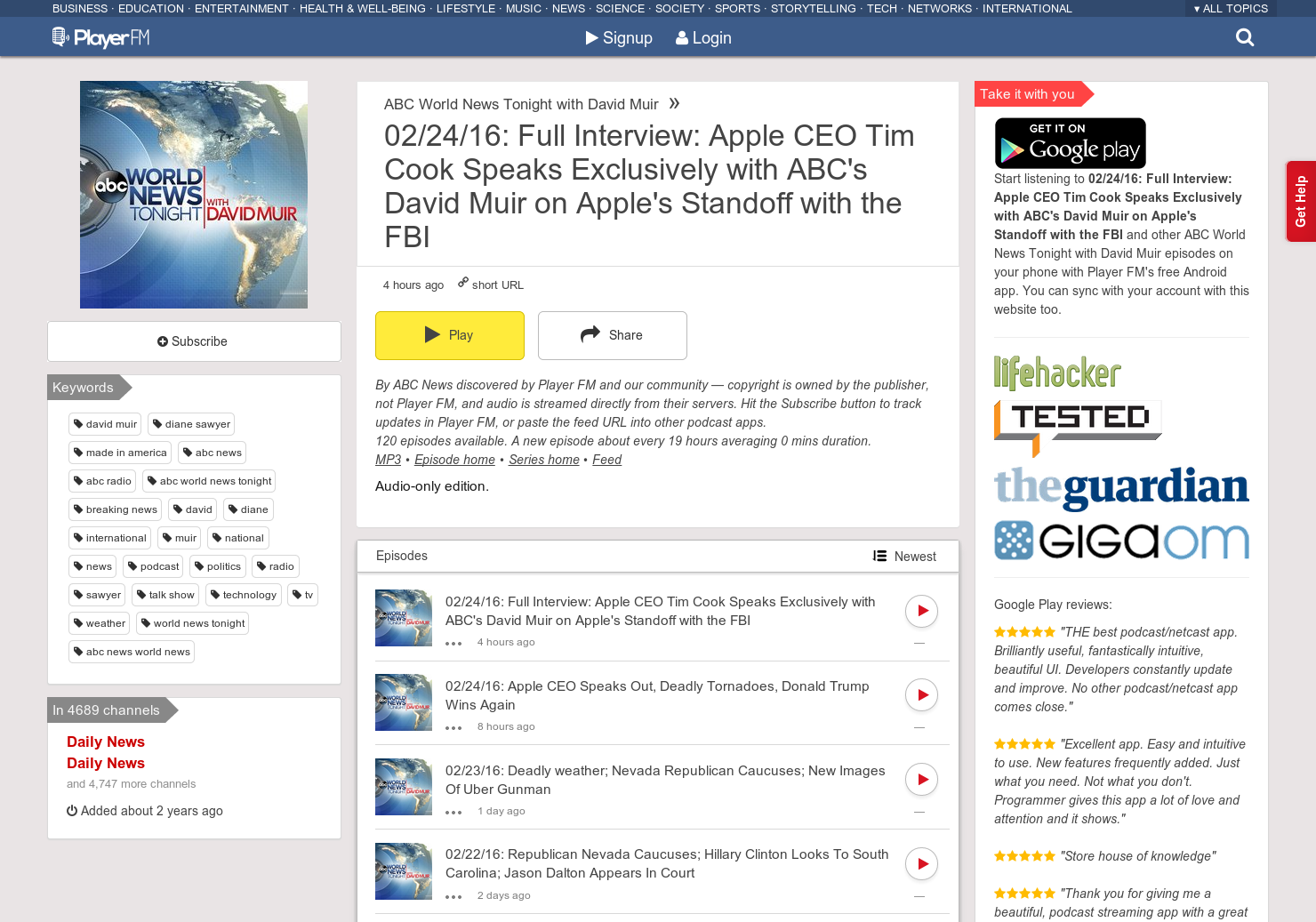 This podcast is an interview with Tim Cook explaining Apple's point of view on the debate with the FBI regarding a backdoor.