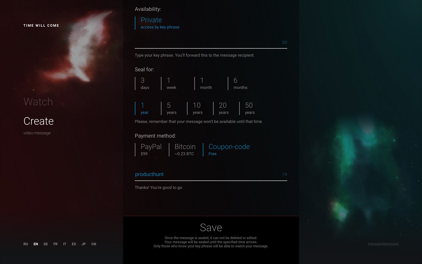 The project "Time Will Come" is the place where you record a video-message and seal it with a secret keyphrase till the right time comes.
