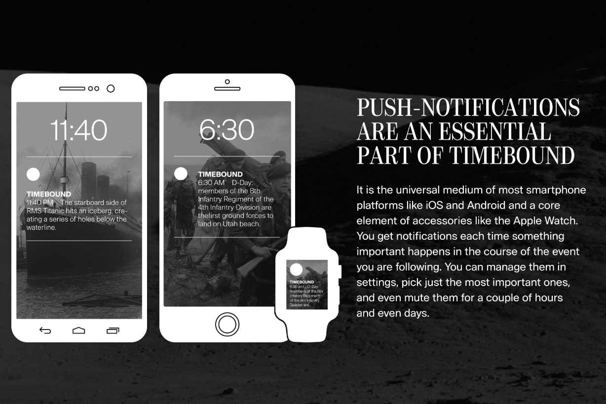 Thank you @mihir! I'm one of the founders of Timebound. The app lets users follow historical events in real time – by sending push-notifications when something important happens in its course. This means you could literally live through the event, hour by hour, minute by minute, and it will take as much time as it did in reality: