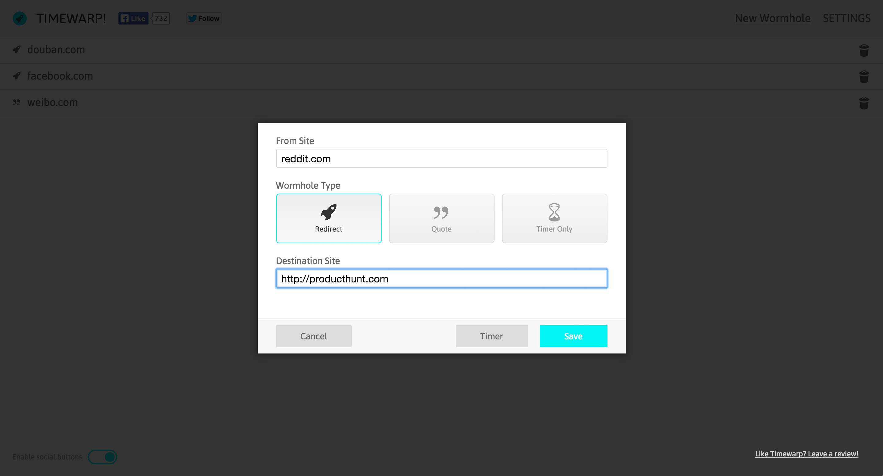 Two years ago I found myself opening and closing Facebook every 5 minutes, even when there were no new post to look at. Now I know I was 'Hooked'. (It's a great book btw). To break that trigger I built Timewarp so every time I open Facebook or Youtube it displays a quote or… See more