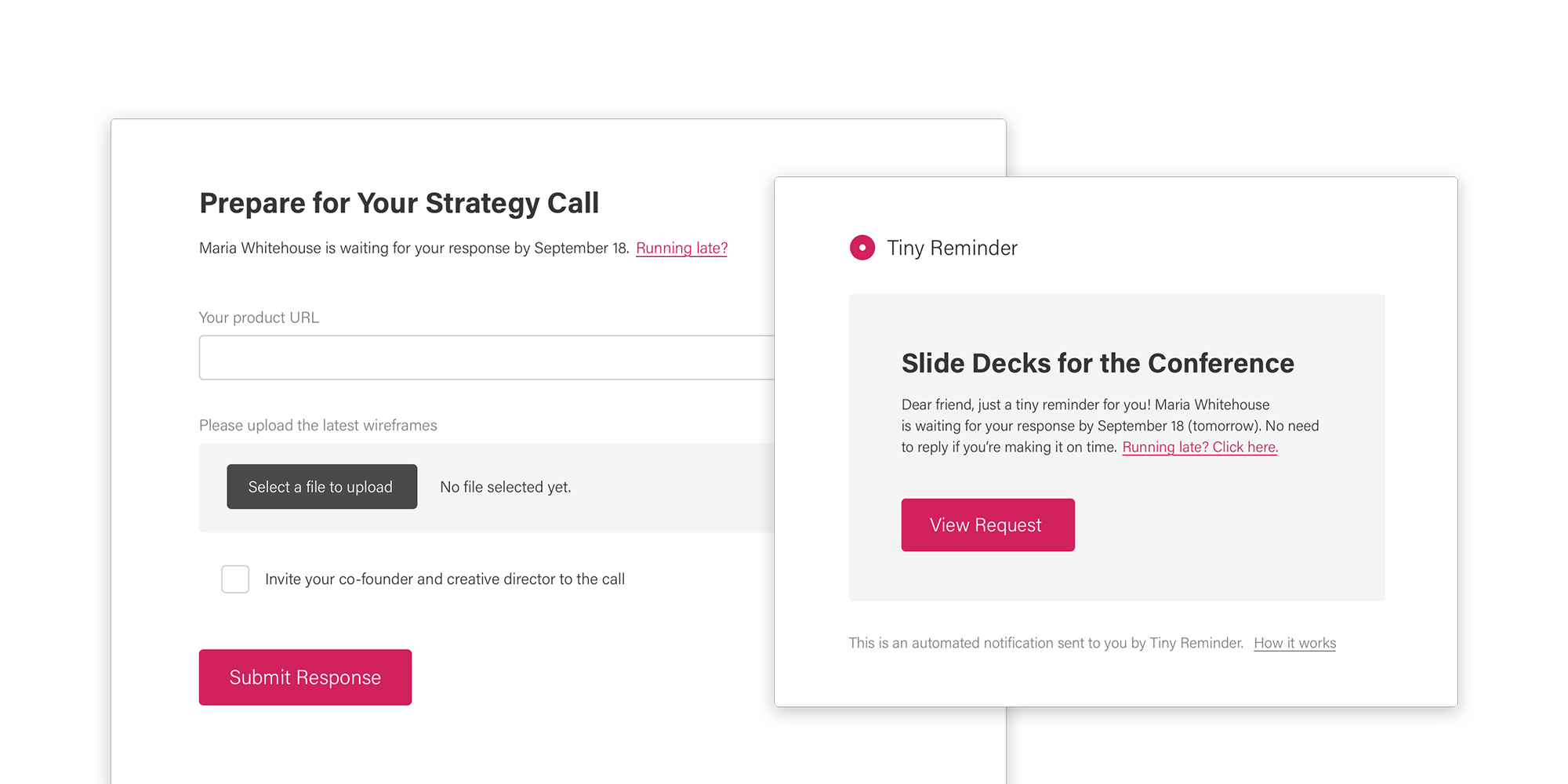 My dear friends, so excited to see this little tool launch on Product Hunt! And thanks Charlie for hunting this. We hope Tiny Reminder will help you feel good while being more productive with clients. No one likes nagging busy people, and we'll do exactly that on your behalf!