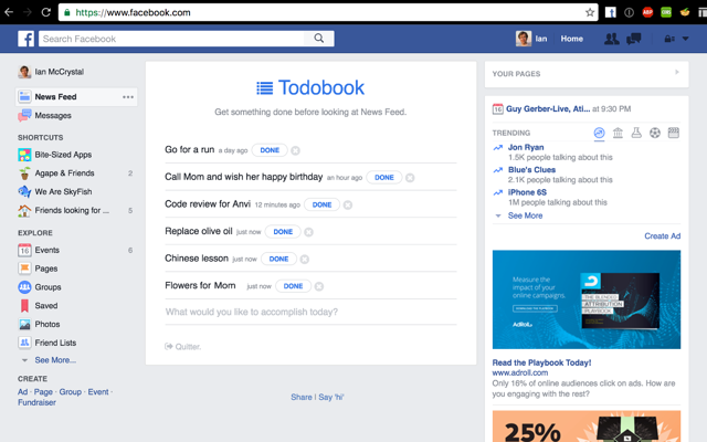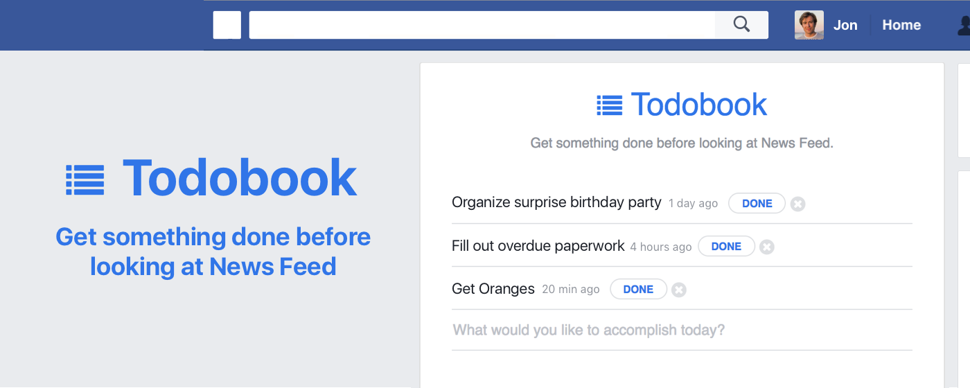 Hello! I'm the maker. I've been wanting something like this for awhile. Now every time I turn to Facebook to procrastinate (and that happens a lot) I'm greeted by a list of things I need to do and I'm reminded to focus on what matters. I've been using this as my primary todo list at work for the last few weeks and it's been great, so I hope some other people… See more