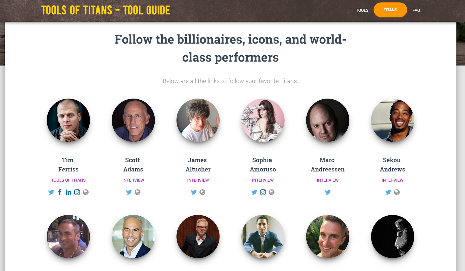 A collection of all of the Titan's recommended/mentioned books, products, supplements, apps, films, podcasts, etc., and the links where to find them. Along with a page to follow all of your favorite Titans (Tim's guests) and their social media links.