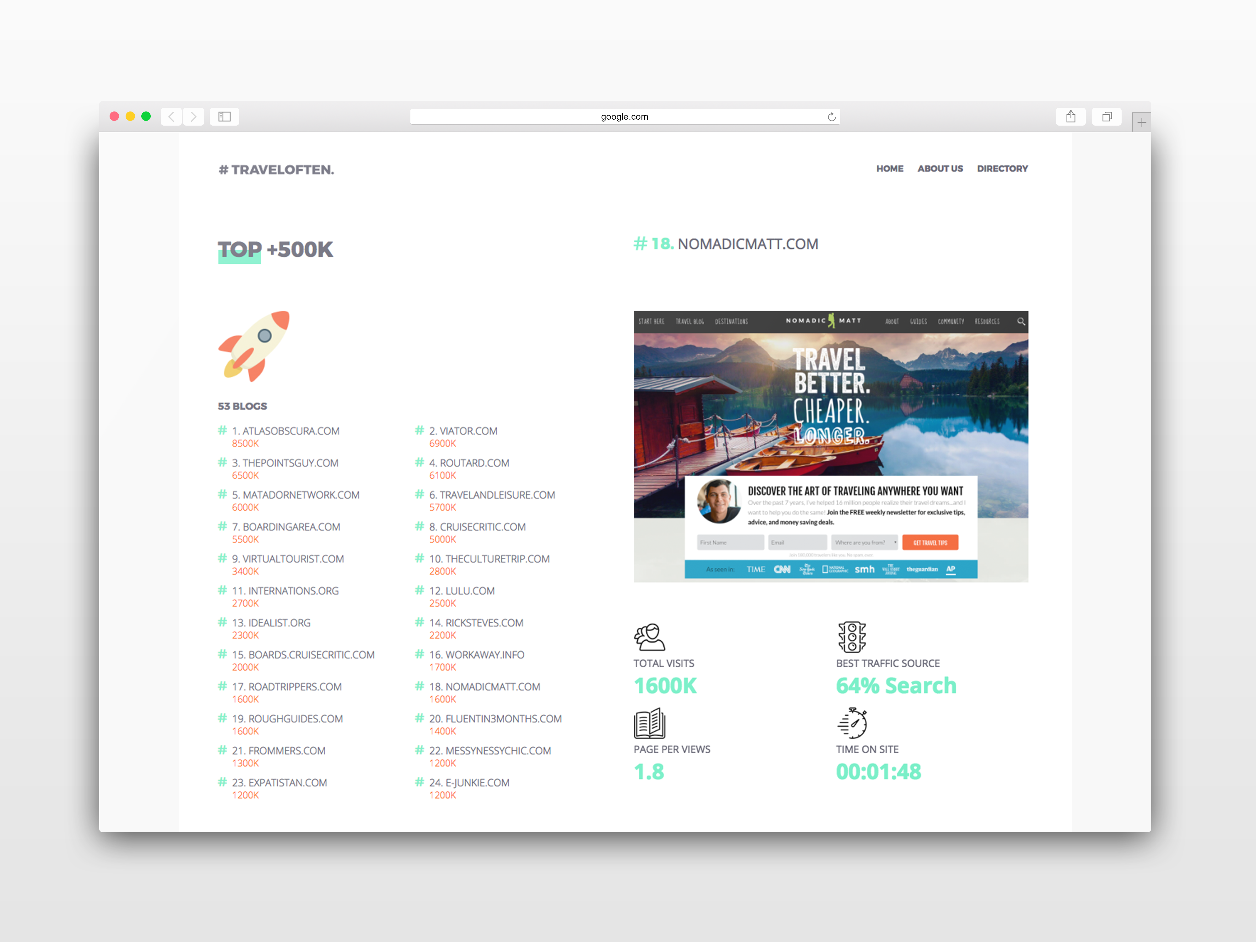This aggregator of top travel blogs is interesting for consumers but indispensable for bloggers and marketers. Travel Often is a great collection of the top travel blogs, with key stats including time on site and traffic sources highlighted. I'm using it to find new audiences for @hitlist_app and new sources of inspiration for my own travels!