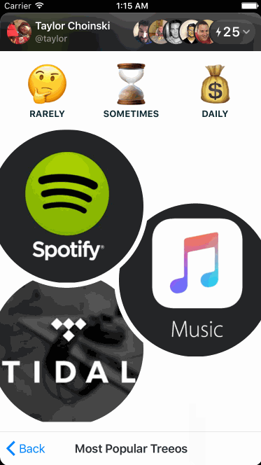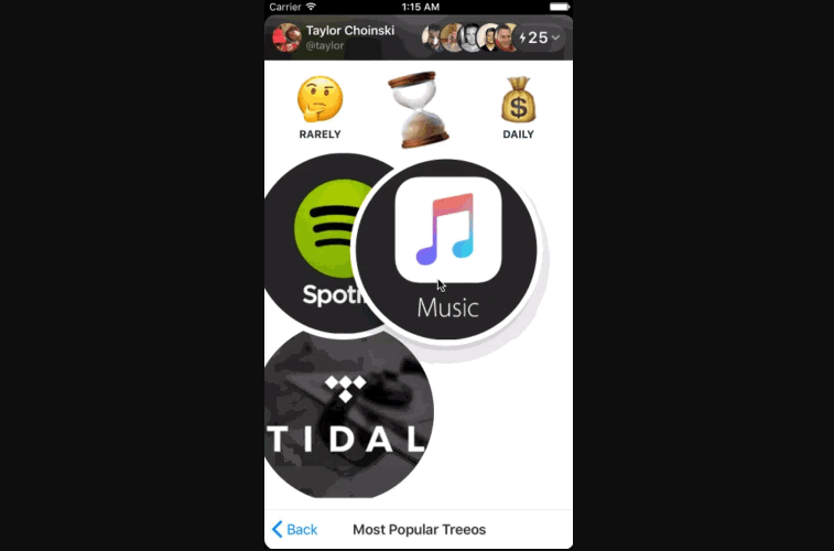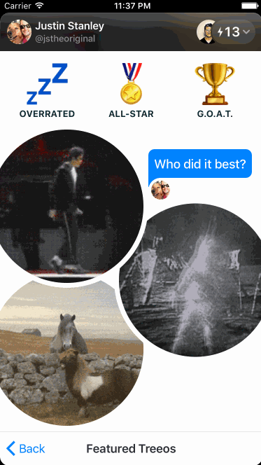 Users can publish their own Treeos by choosing three images or GIFs (e.g. movie posters) and three emoji categories (e.g. 🍅 Rotten, 🎥 Netflix, 🎟 Premiere) and share it with their followers inside the app, or with their friends and networks through SMS, Twitter, Messenger, Facebook and more. Anyone can vote on a shared Treeo on the web without ever downloading the app or making an account.