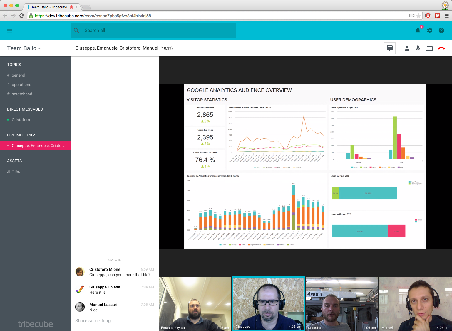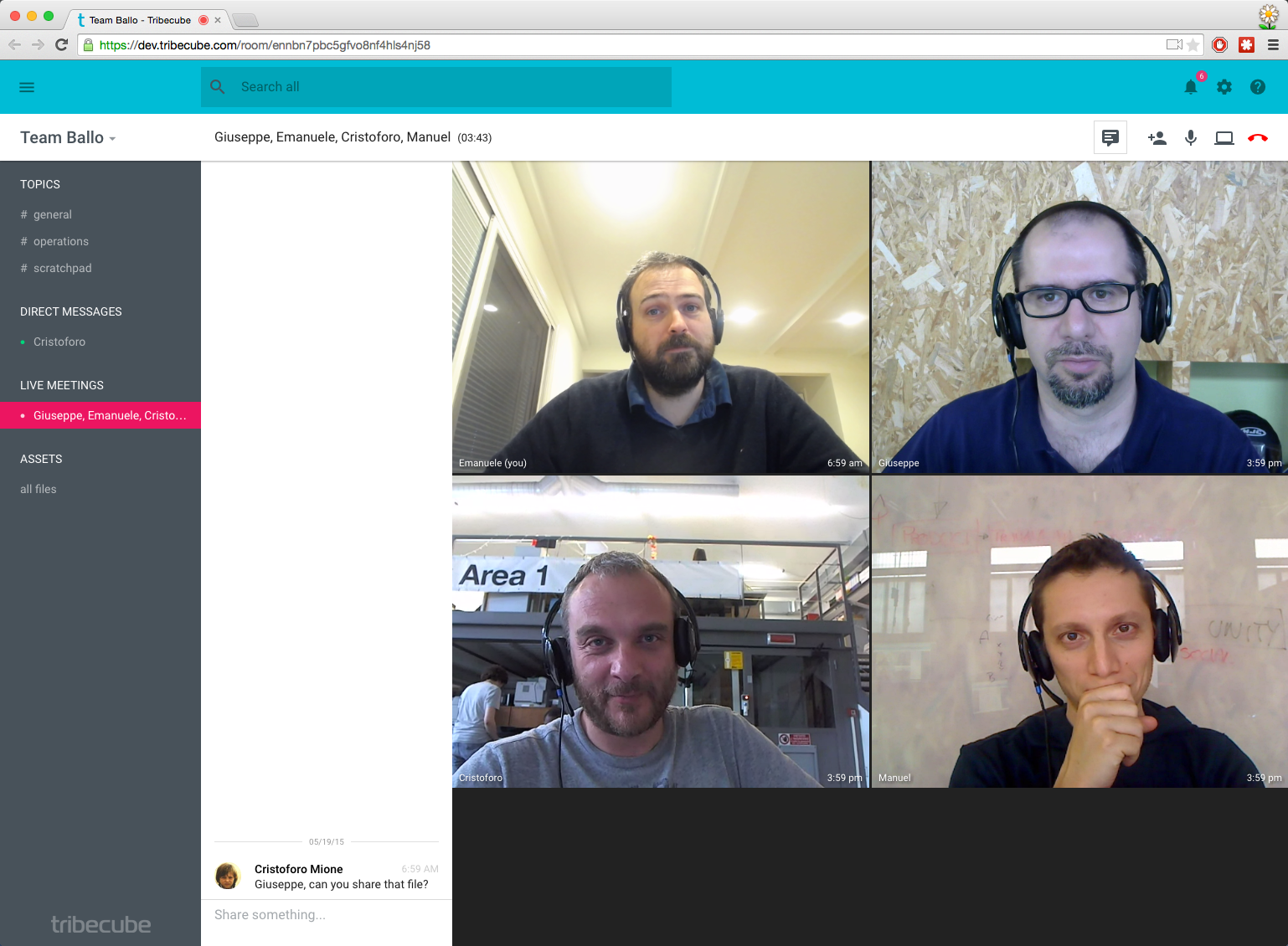 In short, Tribecube provides teams with text chat, file sharing, full indexing and multi-party video meetings with screensharing, all in a browser-based consistent workspace.