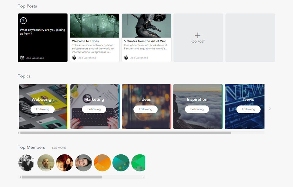 Tribes divides solopreneurs into "tribes" based on industry. Users can create articles, polls, questionnaires, post promotional images and video. Users can also chat one on one or with the large tribe. All in an environment of like minded solopreneuers.