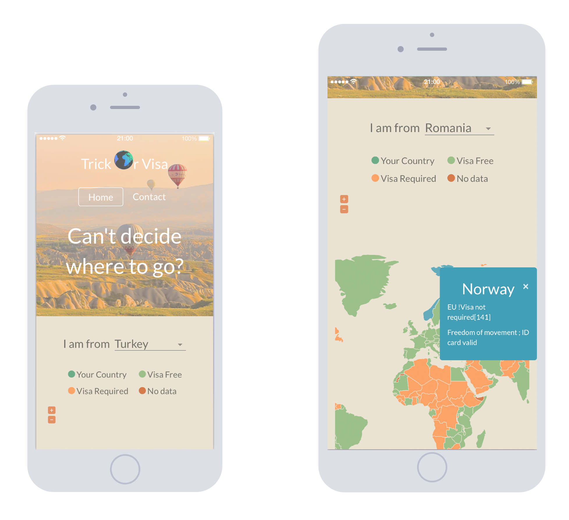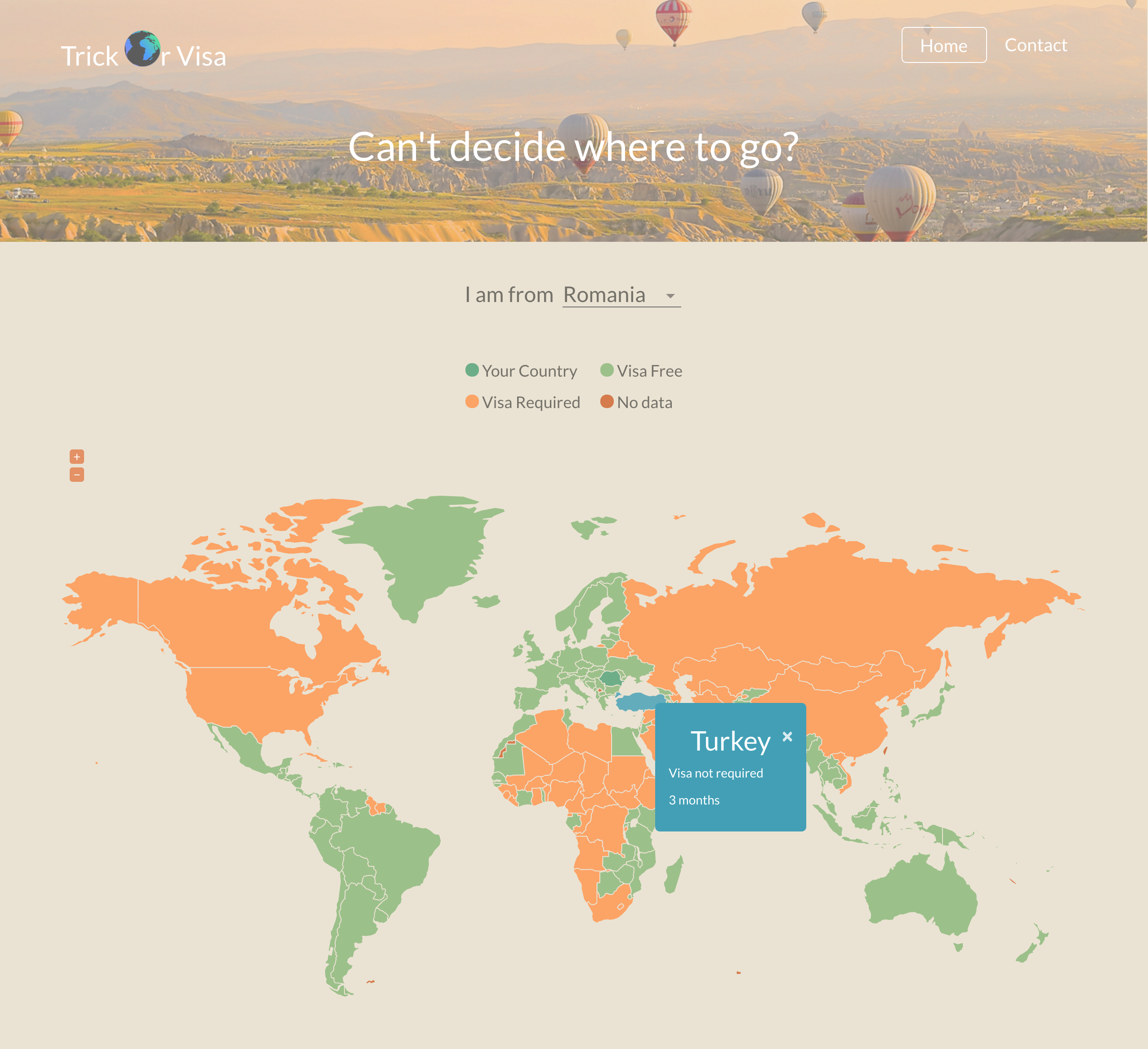 TrickorVisa is a simple web app to see which countries you can visit with/without visa. It's open source and you can check the source code at https://github.com/fehim/TrickOr.... Currently it's still under development and we are open to all kinds of feedback. Also we are trying to make mobile version better.