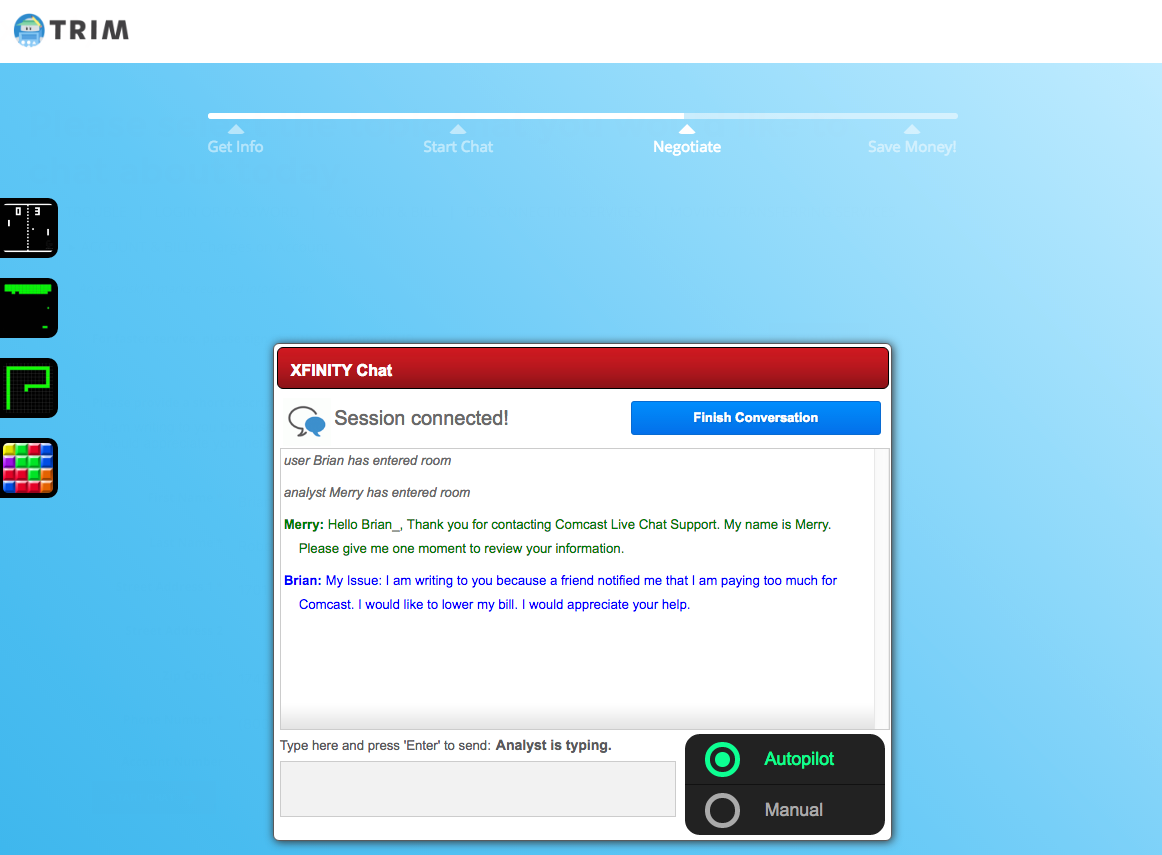 Trim for Comcast is a Chrome extension that talks to Comcast's customer service agents for you.