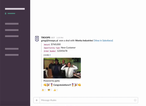 This just makes so much sense for every sales team. We use it at HackerRank and everyone loves the lighthearted GIFs. The product team likes staying informed about new business coming in without feeling like they're interrupted by a 50 "reply all" congrats email.