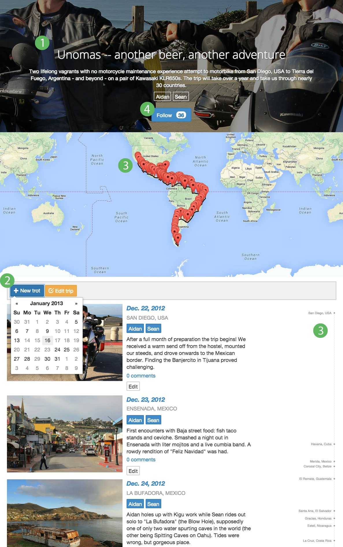 Trott.in is a travel blogging platform that uses a twitter-style character limit to create a travel blog that you can ACTUALLY keep up with and that your friends will ACTUALLY read.