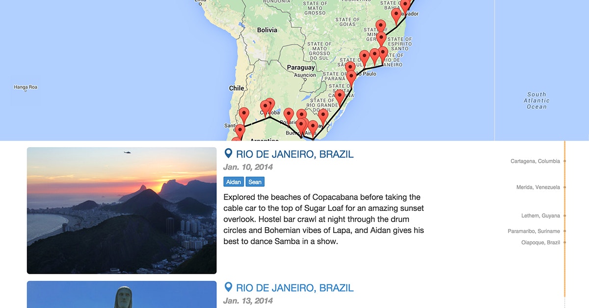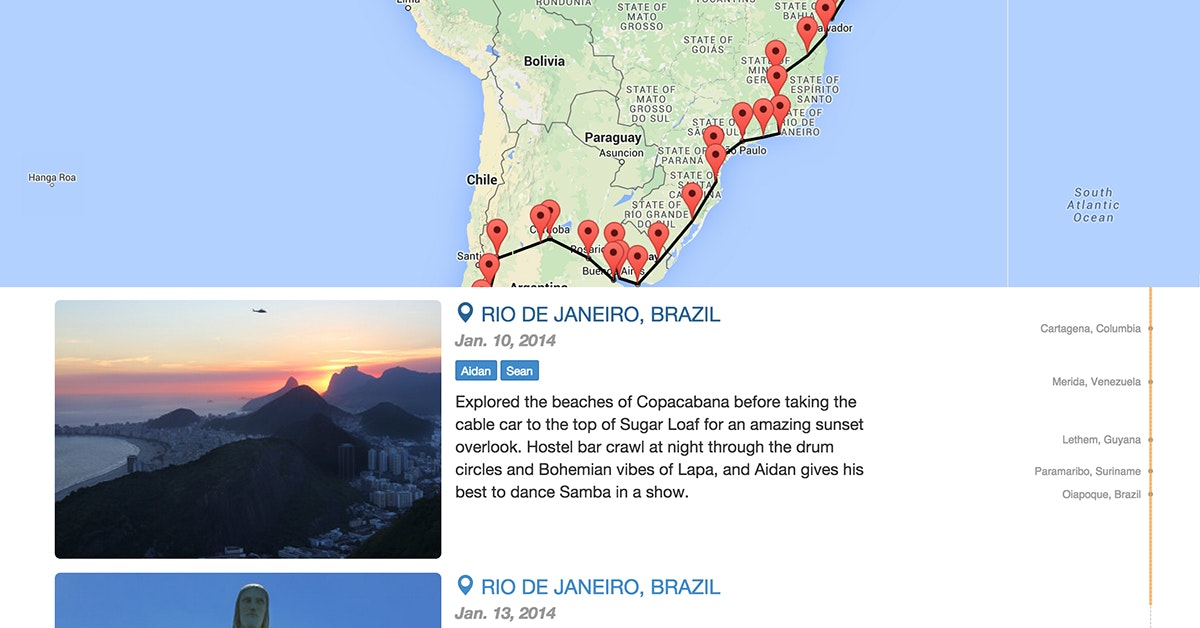 What you give us: 350 characters + 1 photo + your location per day, whenever you feel like it on your trip