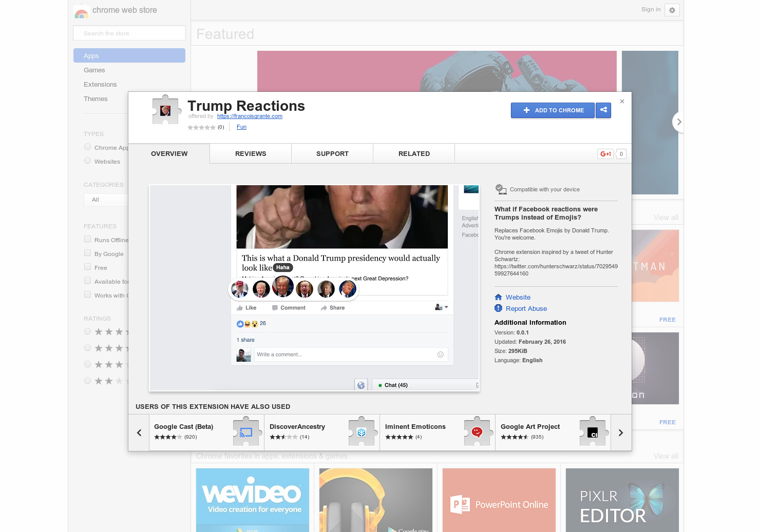 Thanks @picsoung for the hunt! This extension is a quick hack of the new Facebook Reactions. The idea came from this tweet: https://twitter.com/hunterschwar.... I knew it HAD to be done ☺️