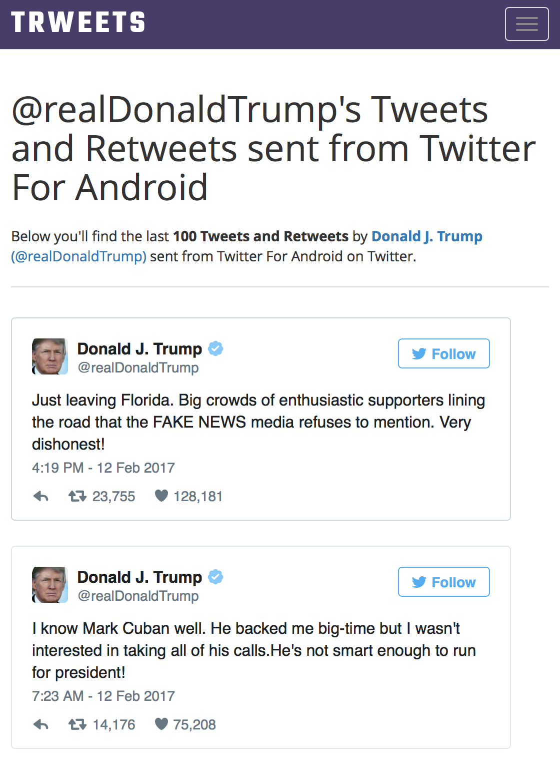 Tracking Trump's Tweets since January 20, 2017 at 12:00pm ET