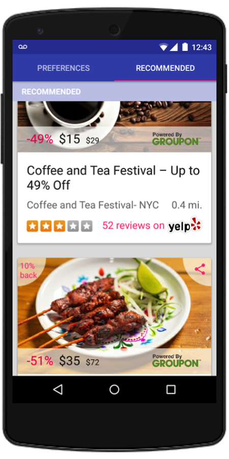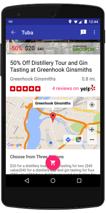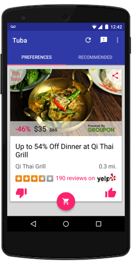 The Tuba app is simple: It uses accurate location data to show you food & drink deals (mainly from Groupon) near you. So you can find deals around you or when you are already at a… See more