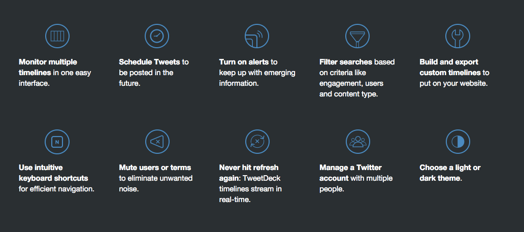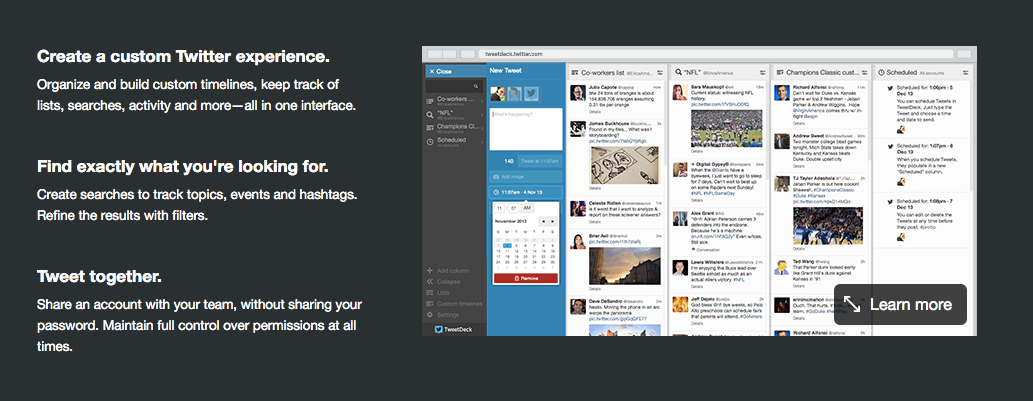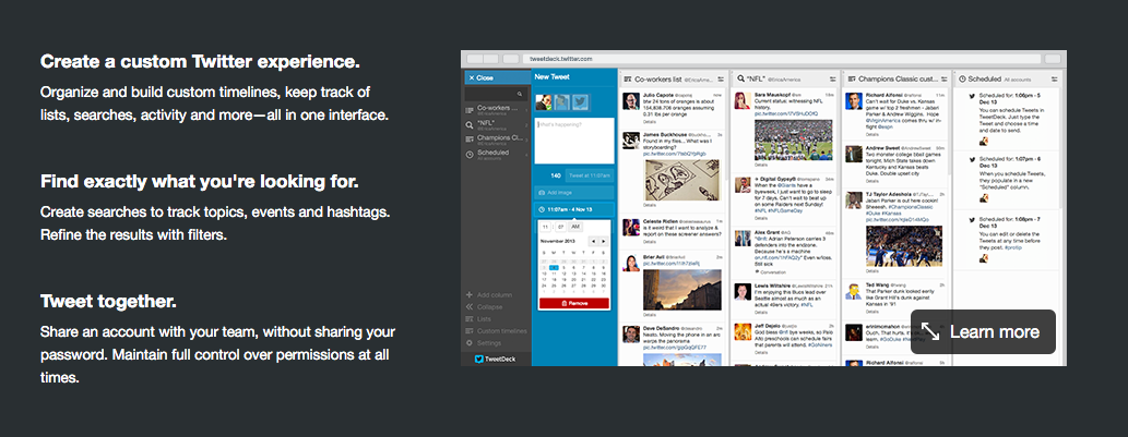 I cmd+tab to Tweetdeck at least 1,000,000 times every day. It's the best power user app and the search columns are super useful (I see every tweet that mentions "@producthunt AND product hunt AND producthunt".