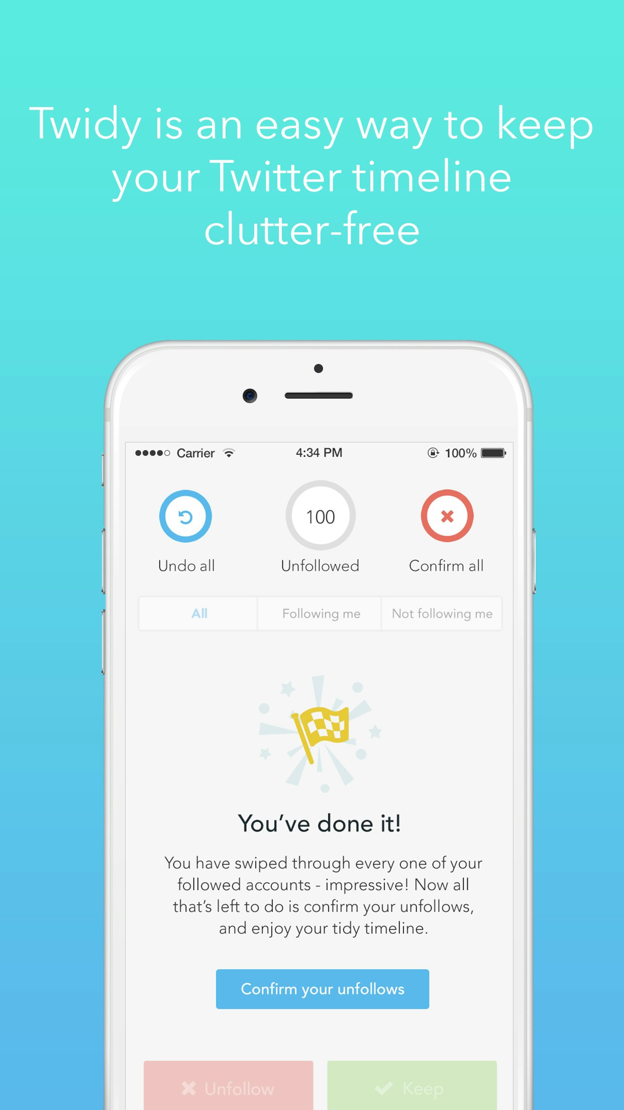 Simple, familiar swipe interface for clearing out the rubbish from your twitter timeline. Keep it lean!