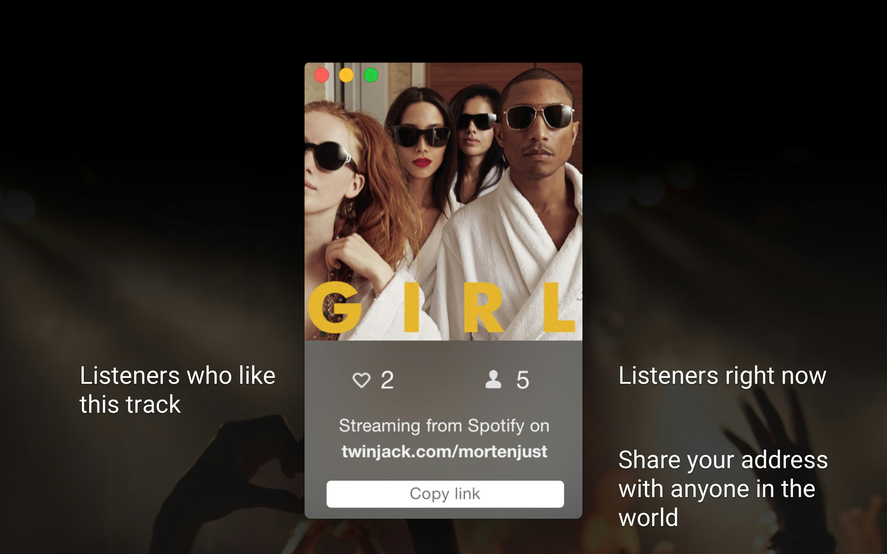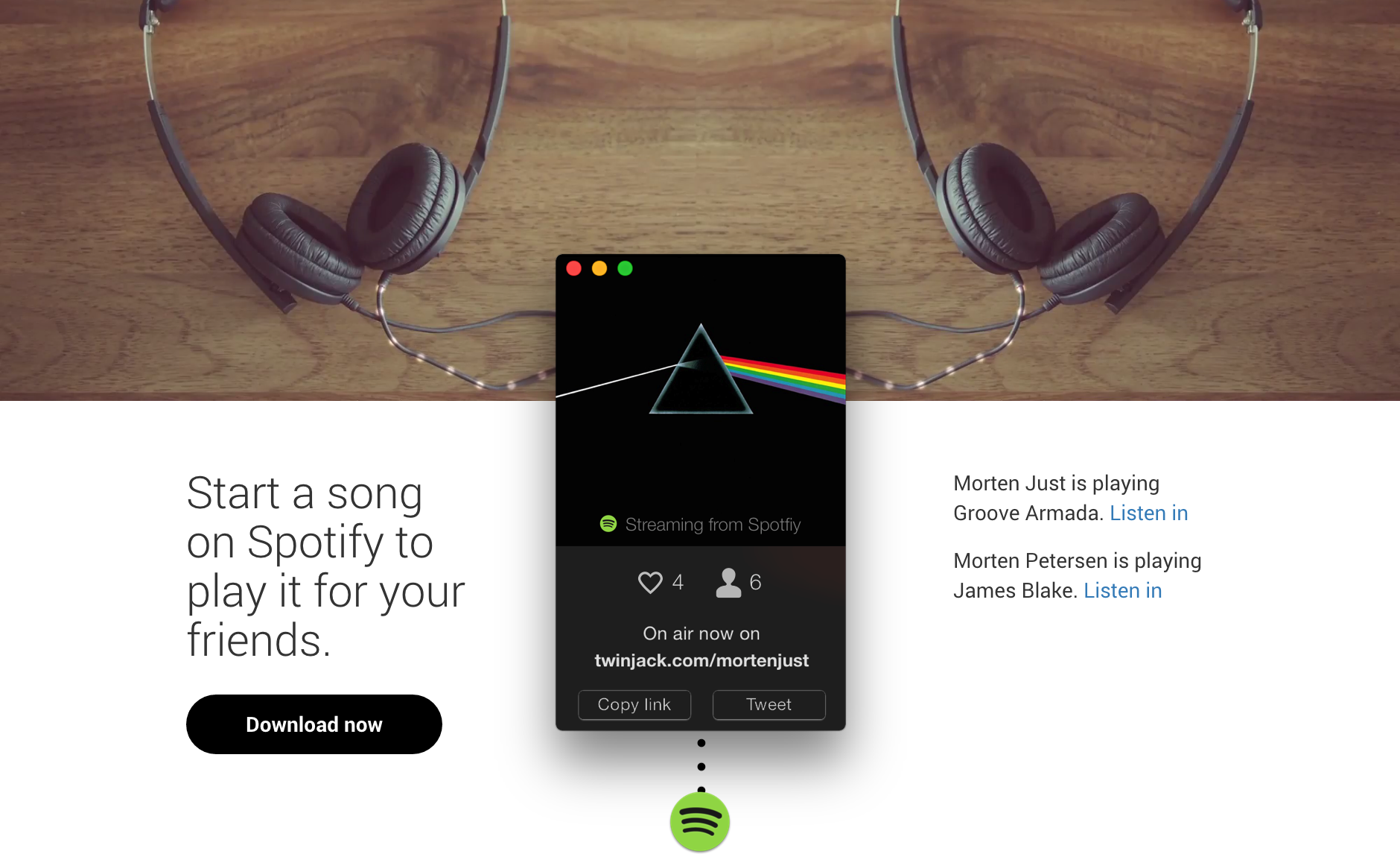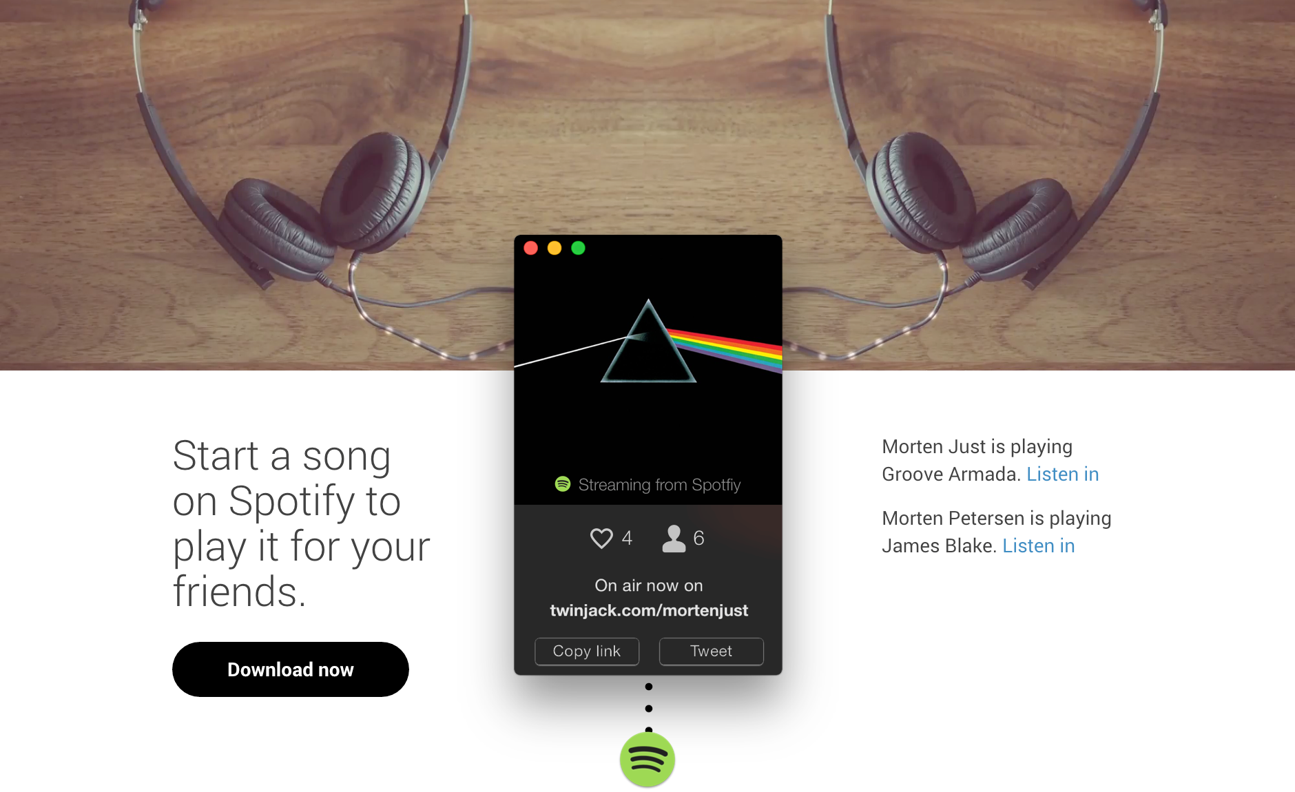 You're in an office and someone plays music. Everyone can hear it. Why isn’t it that simple online? For us personally, we rarely have a chance to listen to music together. Morten is in California, an 11 hours flight away from me and the rest of his friends in Denmark. And that's why we built Twinjack.