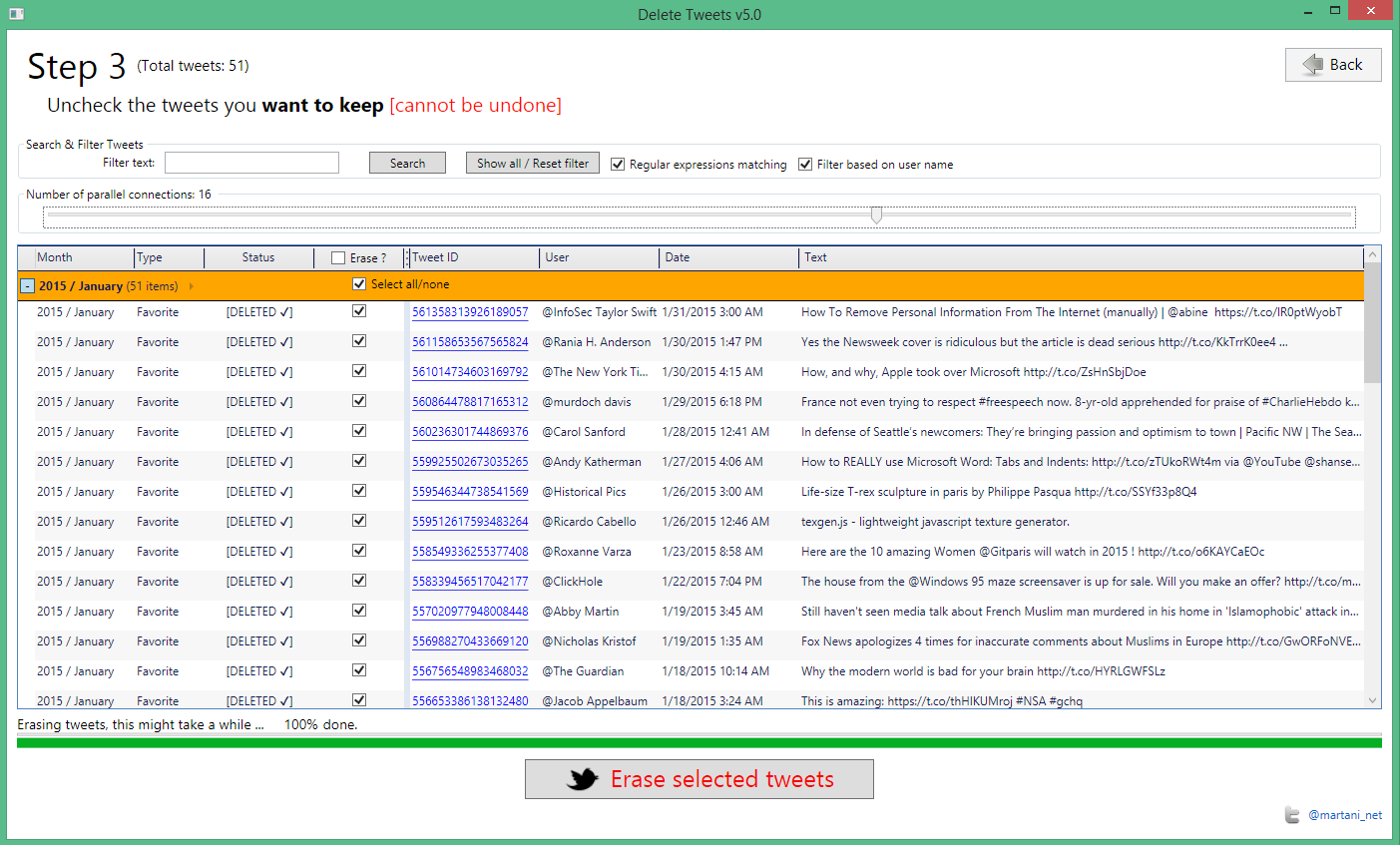 I'm the maker of Twitter Archive Eraser: an application that allows you to search, filter and to delete all your tweets, favorites and DMs automatically.