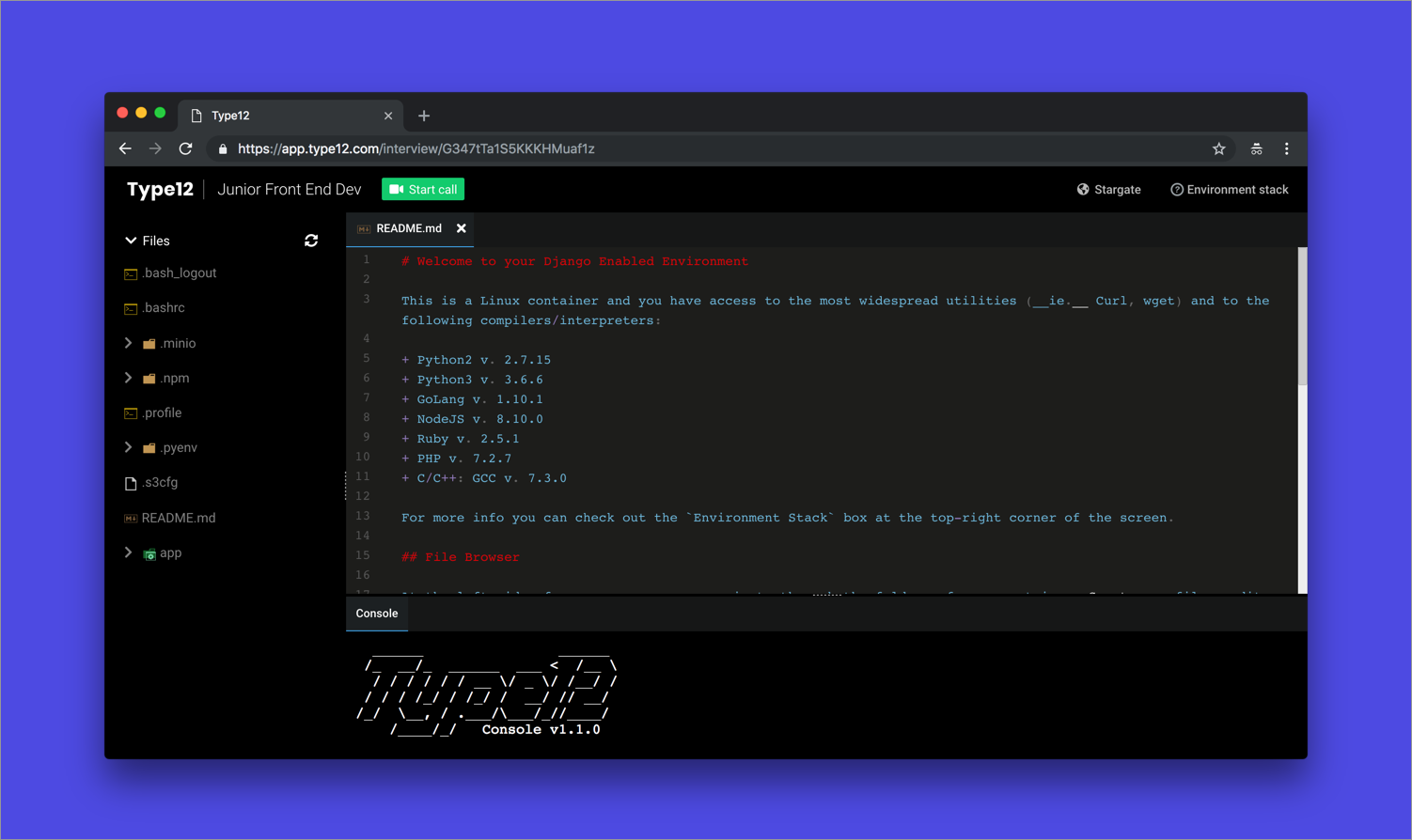 In a bit more technical details, for each interview, Type12 creates a new (docker instance under hood) sandbox fully configured with languages (Python, JS, Ruby, Java, Scala, etc) frameworks (Django, Flask, Ruby on Rails, Node, Spring, etc), databases (MongoDB, Redis, MySQL, PostgreSQL, etc) and other technologies (Amazon S3, Amazon DynamoDB, etc) of your choice.