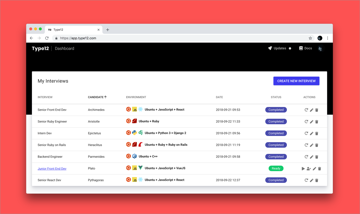 We made Type12 to let companies go beyond riddles and brain-teasers when testing candidates, but actually putting them in their day-to-day scenarios. How? No better way than simulating their production environment and pair program with them on real world problems.