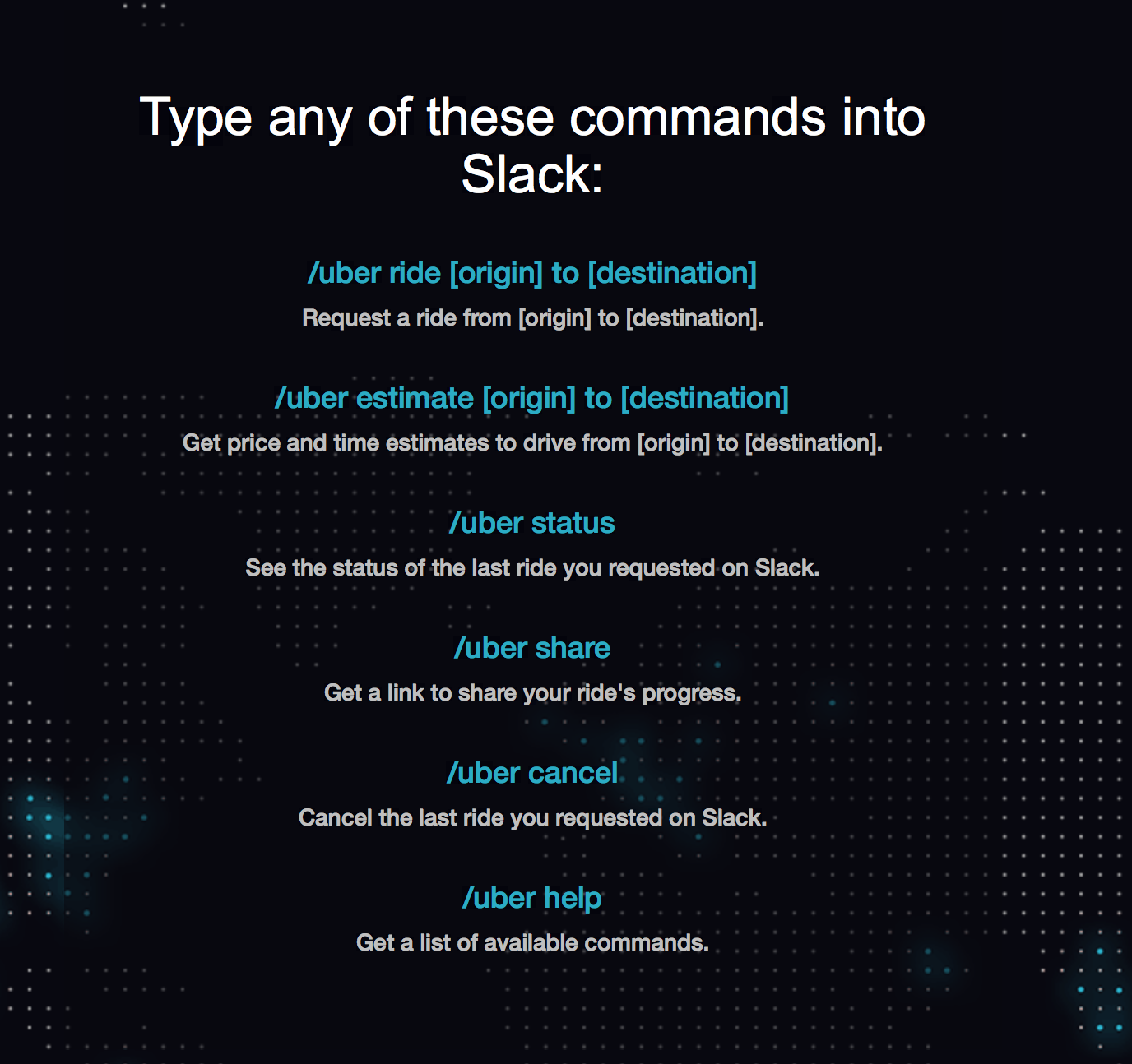 /uber status -- See the status of the last ride you requested on Slack.