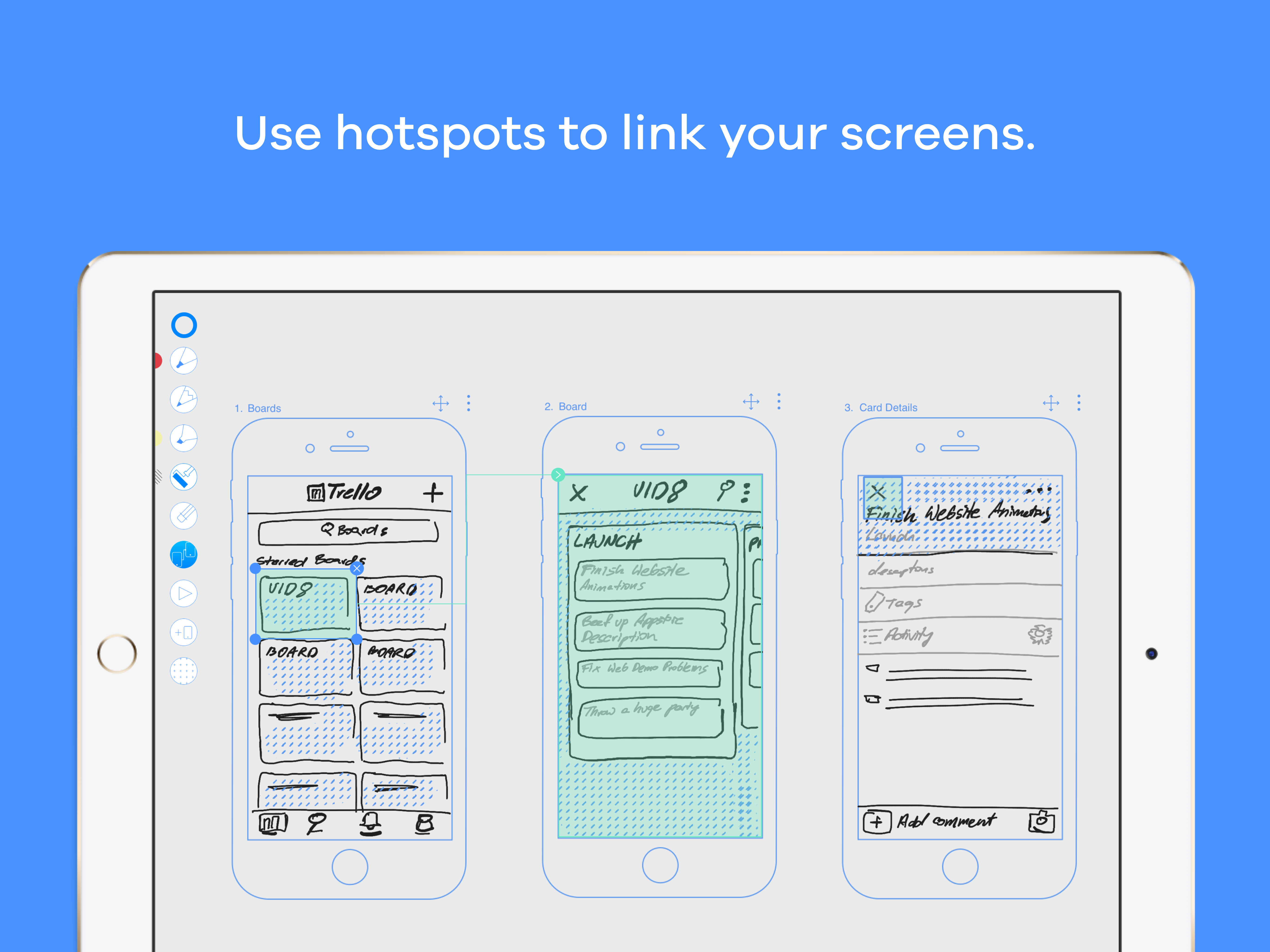 > Create your prototypes by linking the screens together with hotspots.