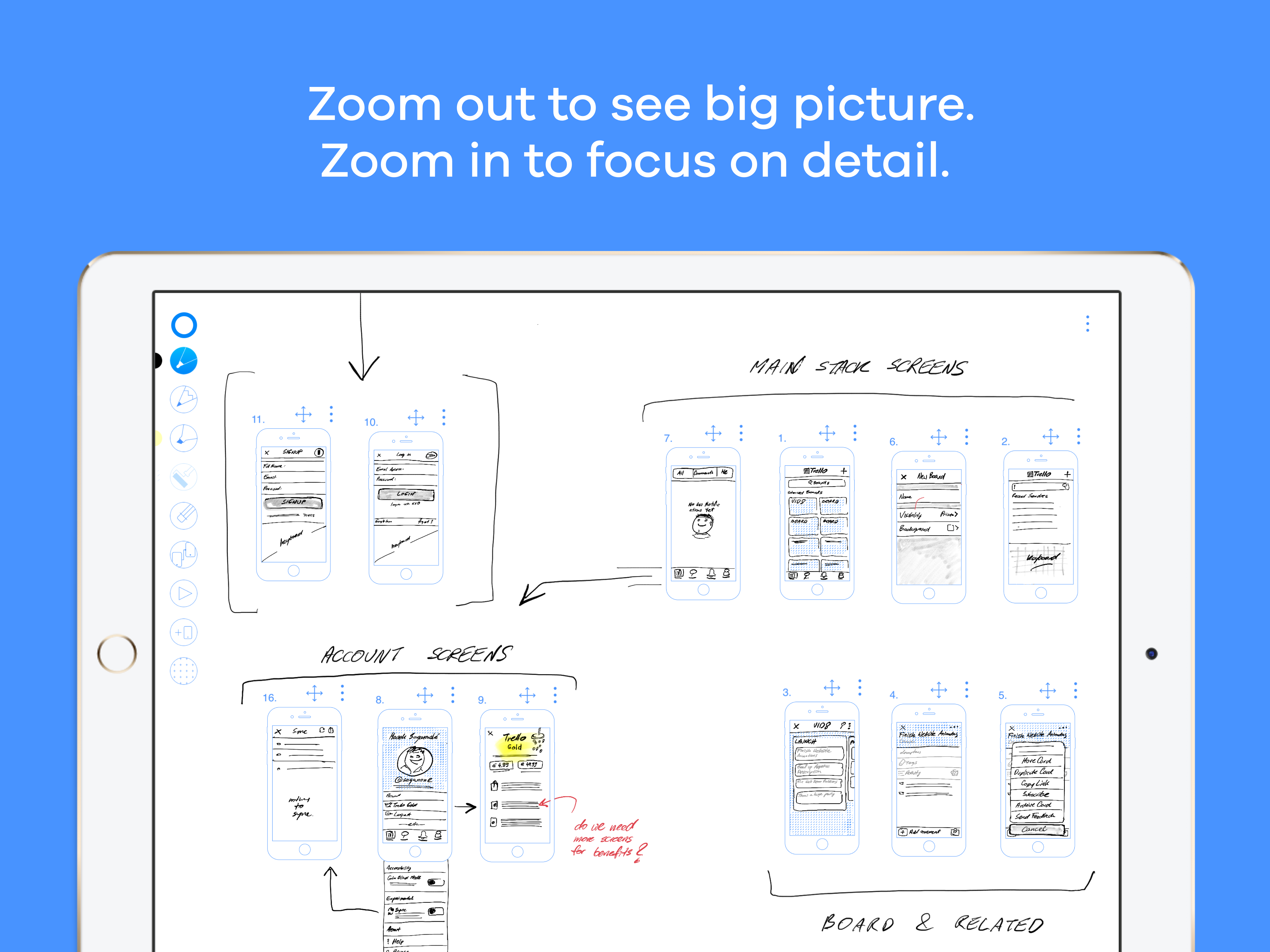 > Move your screens around on a huge canvas. Zoom out to see big picture. Zoom in to focus on detail.