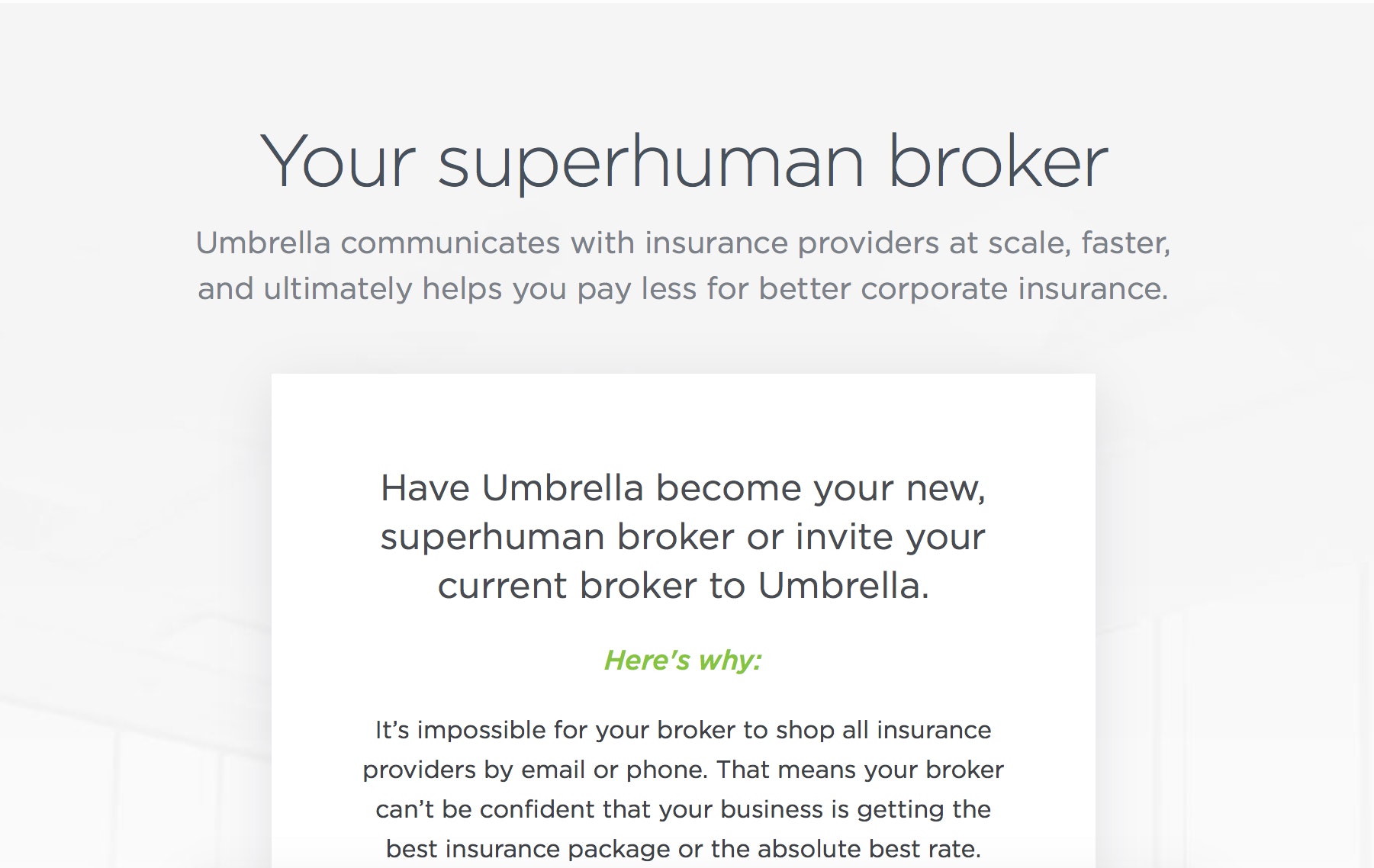 Umbrella is pleased to launch with ProductHunt. The excitement and momentum around the insurance tech sector have continued to accelerate. Look to YC's Zenefits for example. So, why did we create Umbrella? It’s impossible for your company's insurance broker to shop all insurance providers by email or phone. That means your broke… See more